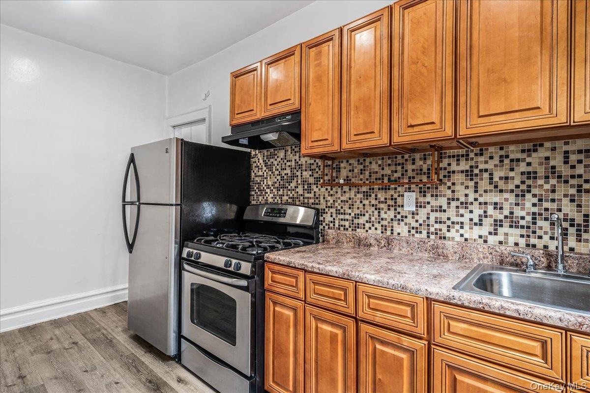 - Kitchen featuring appliances with stainless steel finishes, radiator, tasteful backsplash, light wood-type flooring, and brown cabinetry