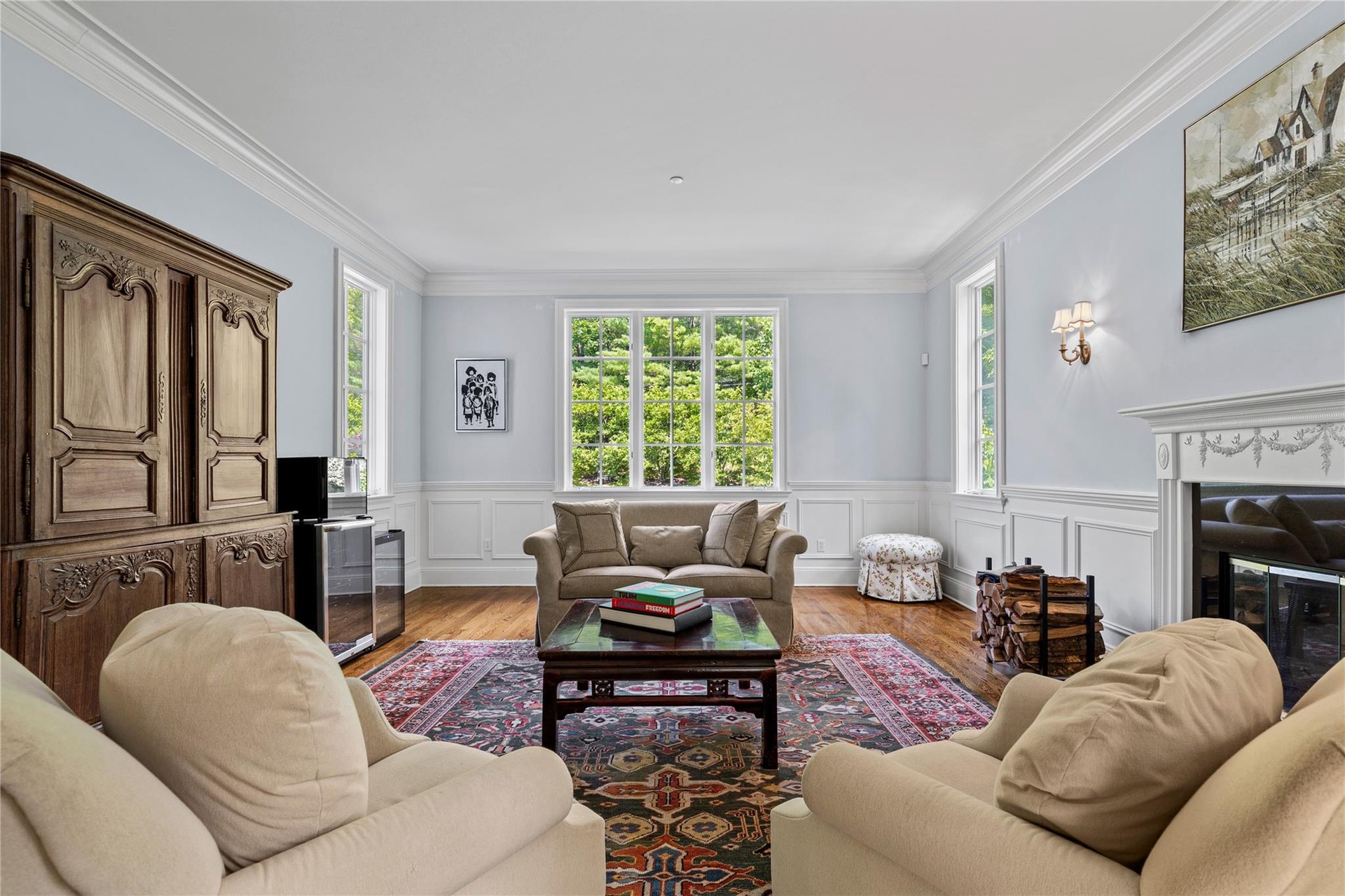- Living area with wood finished floors, a glass covered fireplace, ornamental molding, beverage cooler, and a wainscoted wall