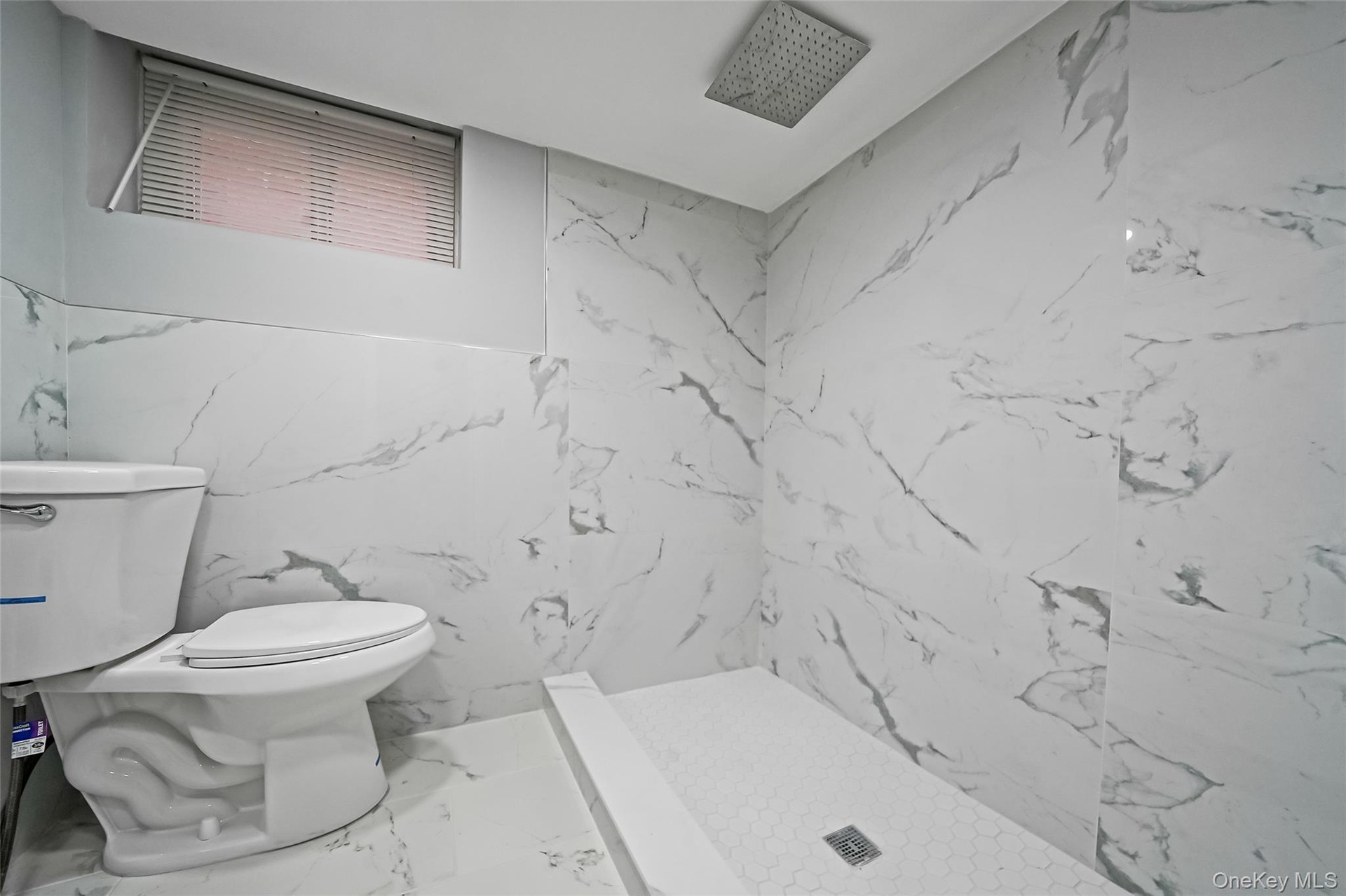 - Full bath featuring a stall shower and marble finish flooring