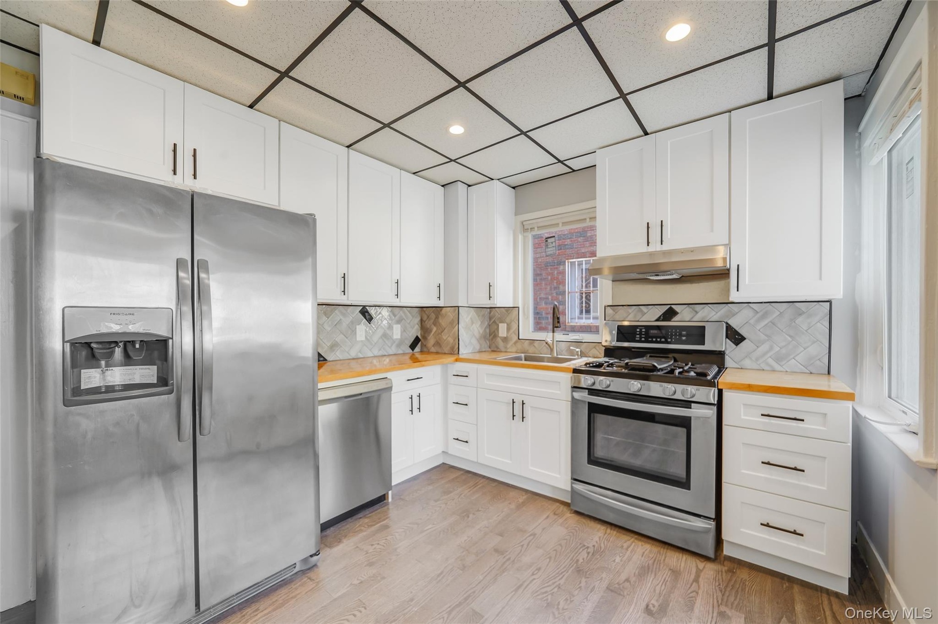 - Kitchen with appliances with stainless steel finishes, a drop ceiling, white cabinets, wooden counters, and light wood-style floors