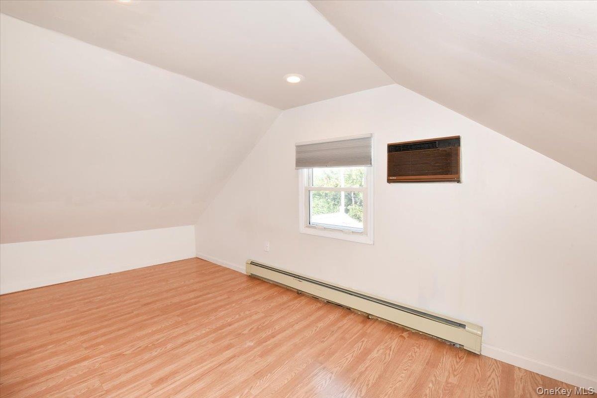 - Bonus room featuring a baseboard heating unit, light wood-type flooring, vaulted ceiling, and a wall unit AC