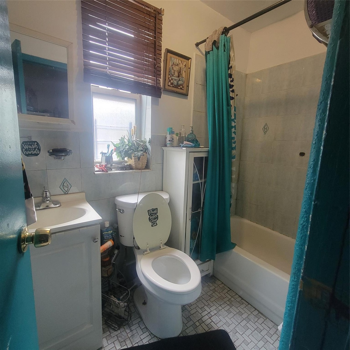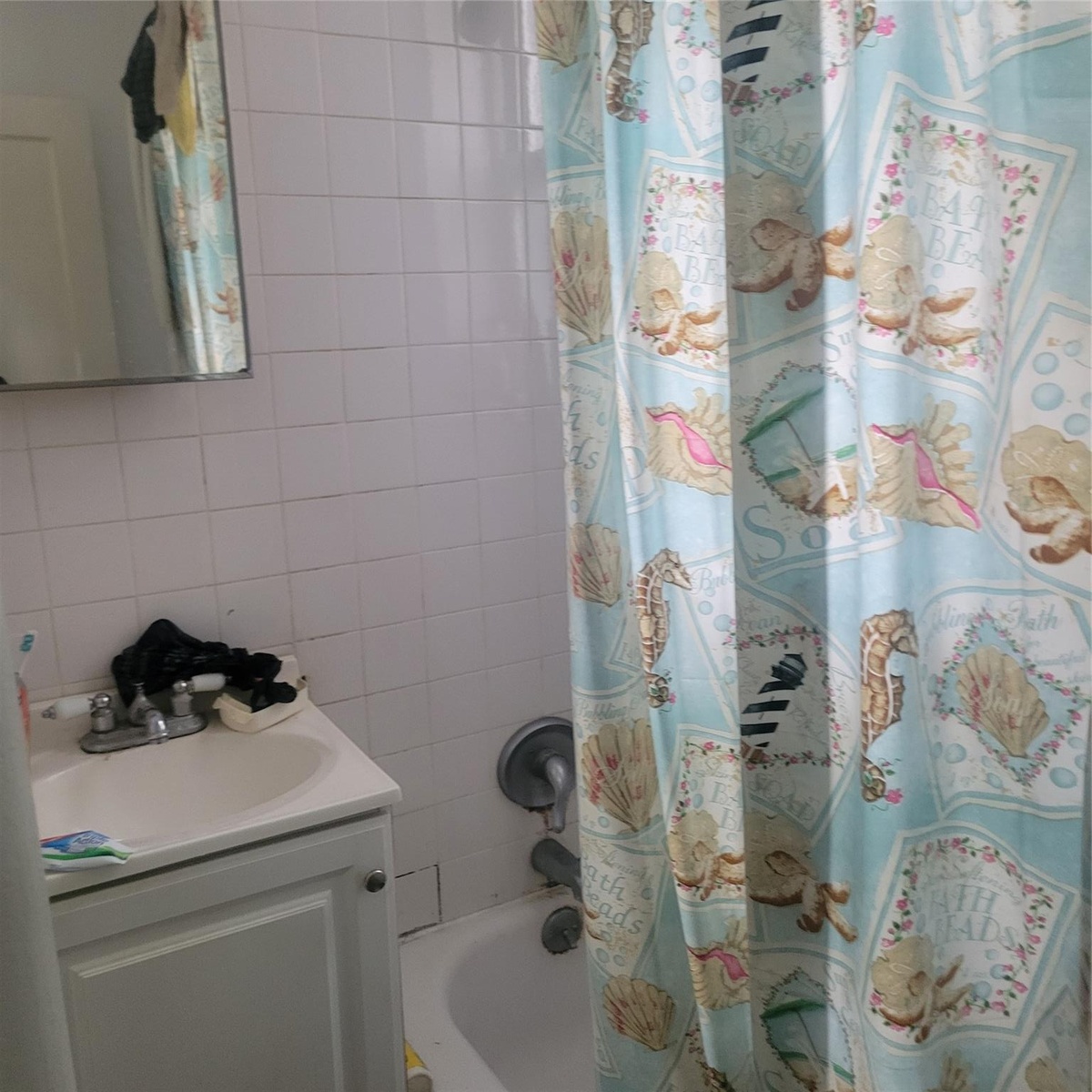 - Bathroom featuring vanity, tile walls, shower / bath combo with shower curtain, and tile patterned flooring