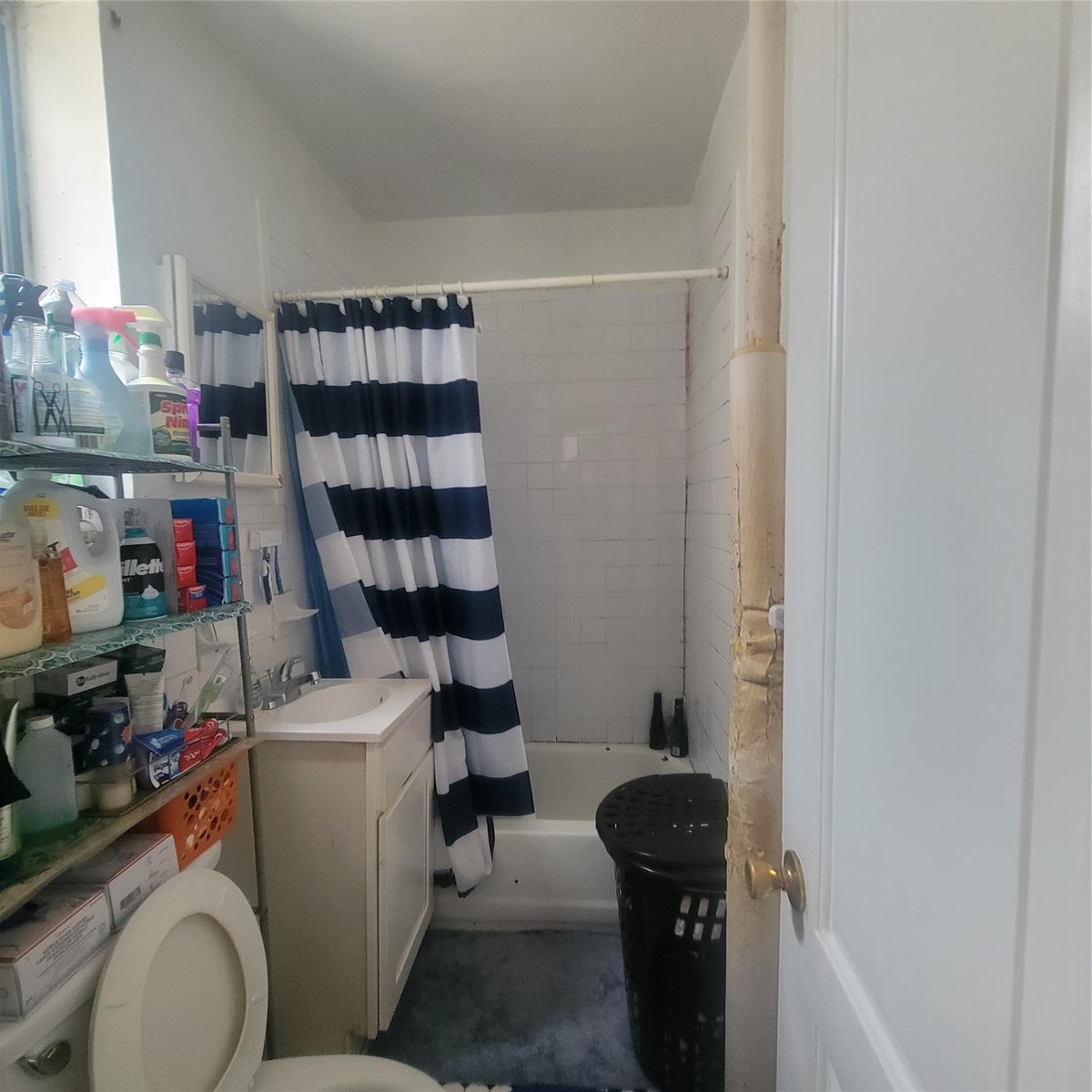 - Bathroom with vanity and shower / bath combo with shower curtain