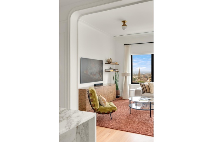 Separated by an arched open partition, the great room is rich with pre-war-inspired detailing, including custom-designed trim, moldings, and enhanced with curated custom lighting throughout and unparalleled views of New York Harbor, the Statue of Liberty and Manhattan.