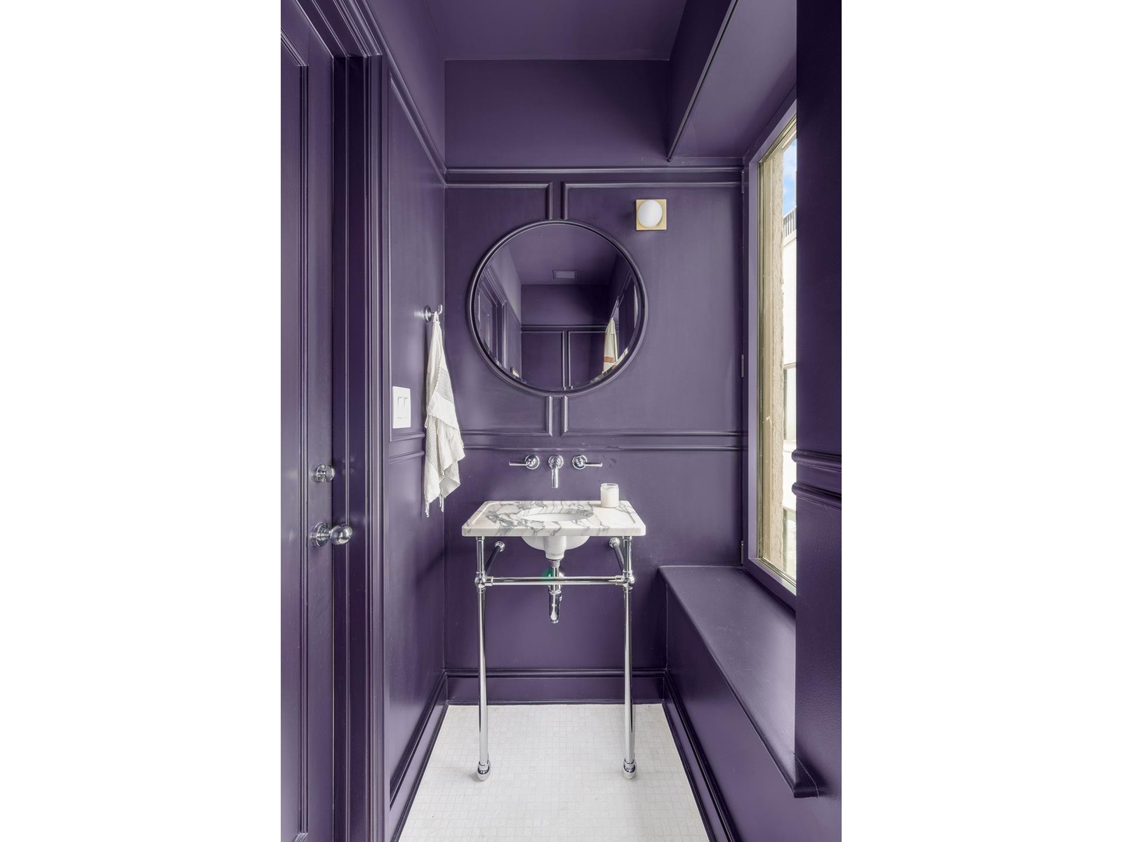 The eat-in chef's kitchen boasts honed Estremoz marble countertops and backsplash, an integrated appliance suite by Wolf and Sub-Zero, and a statement Calacatta Vagli marble island with cast iron undermount sink and Dornbracht chrome faucet. Paneled cabinetry by Workstead-now fully customized for enhanced functionality-echoes the deco coving and baseboards. The kitchen is completed with ample pantry space.