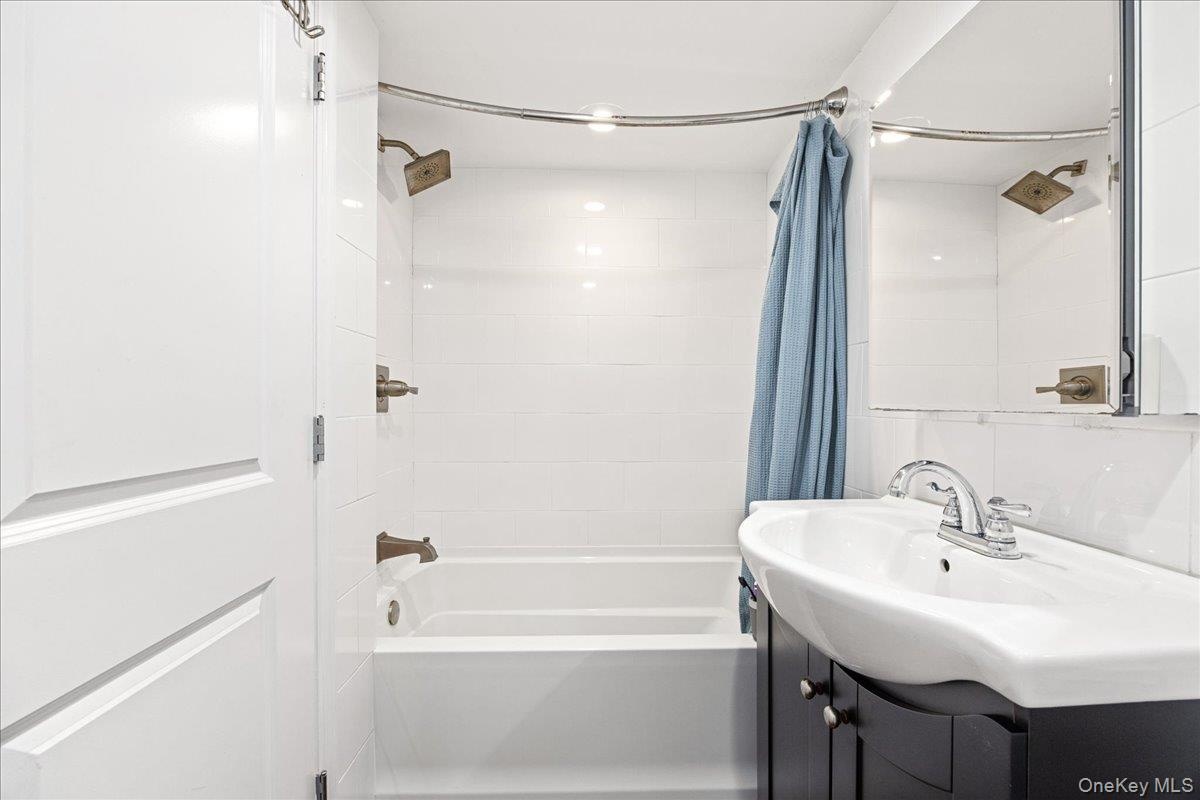 - Full bath featuring shower / bath combo with shower curtain and vanity
