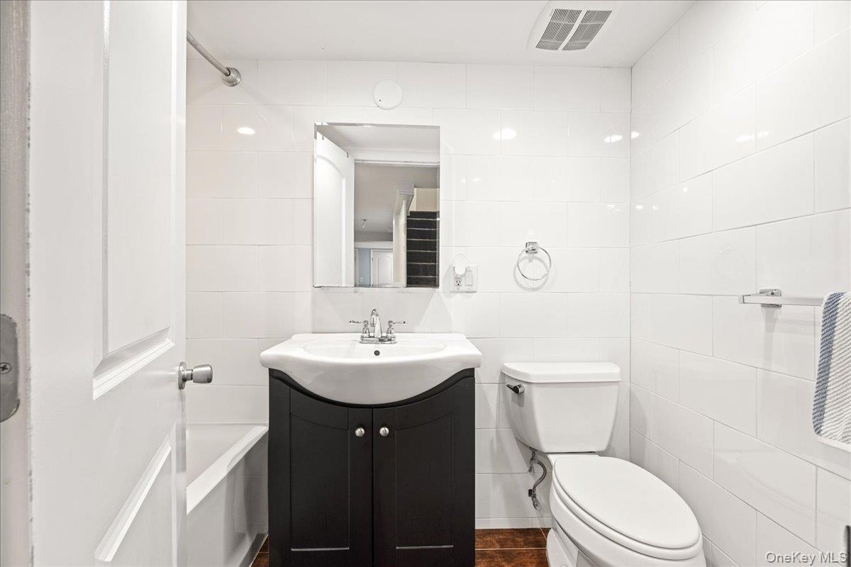 - Full bath featuring vanity and tile walls