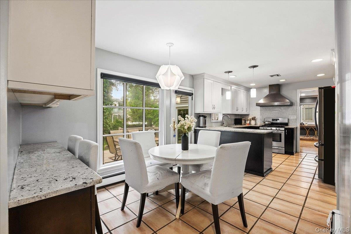 - Dining space featuring light tile patterned flooring and baseboard heating
