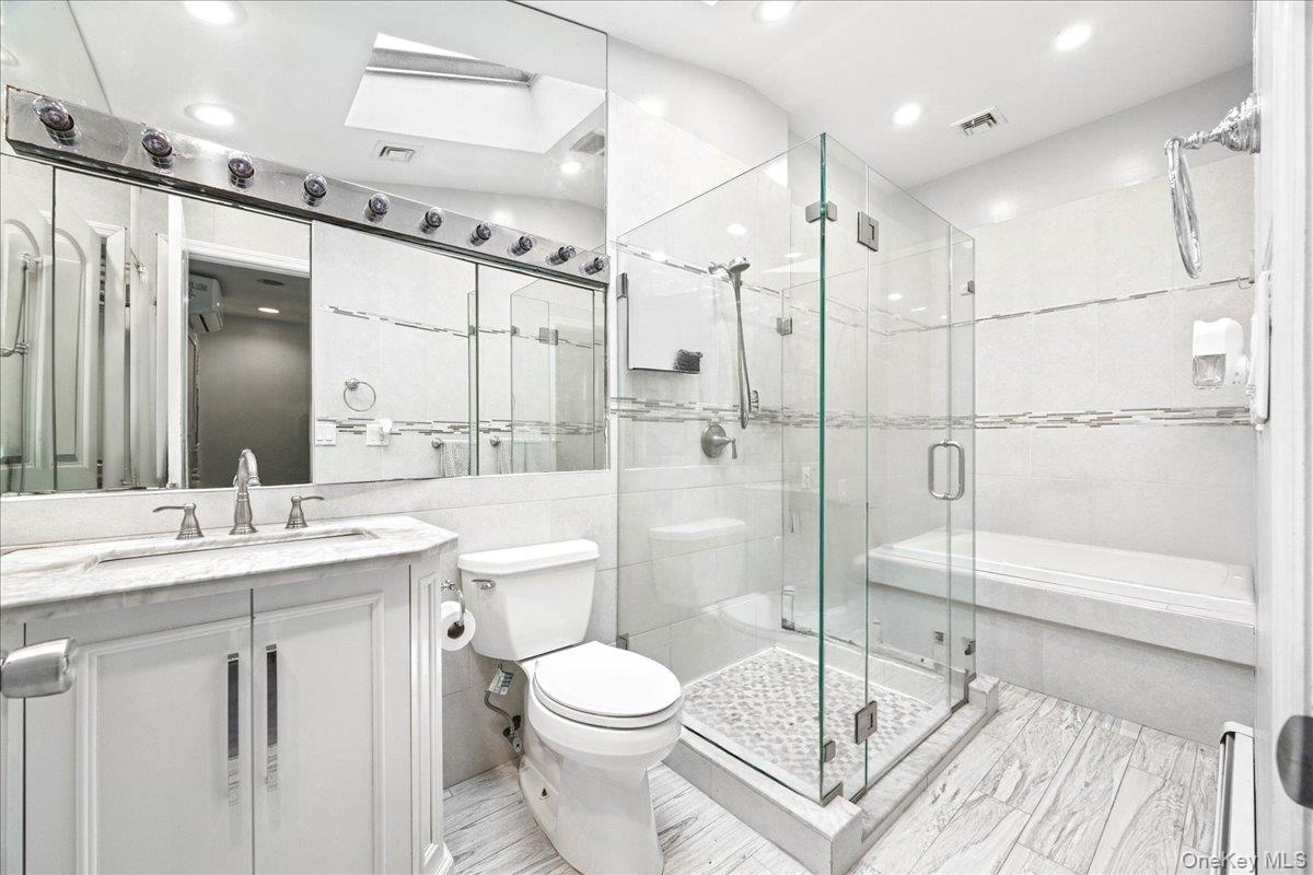 - Bathroom featuring a skylight, vanity, baseboard heating, a shower stall, and recessed lighting