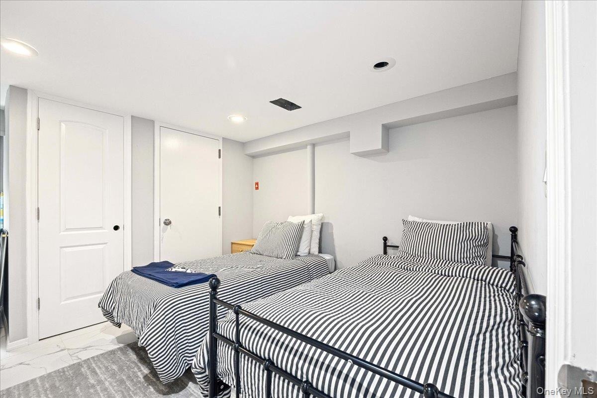 - Bedroom featuring light marble finish floors, recessed lighting, and a closet
