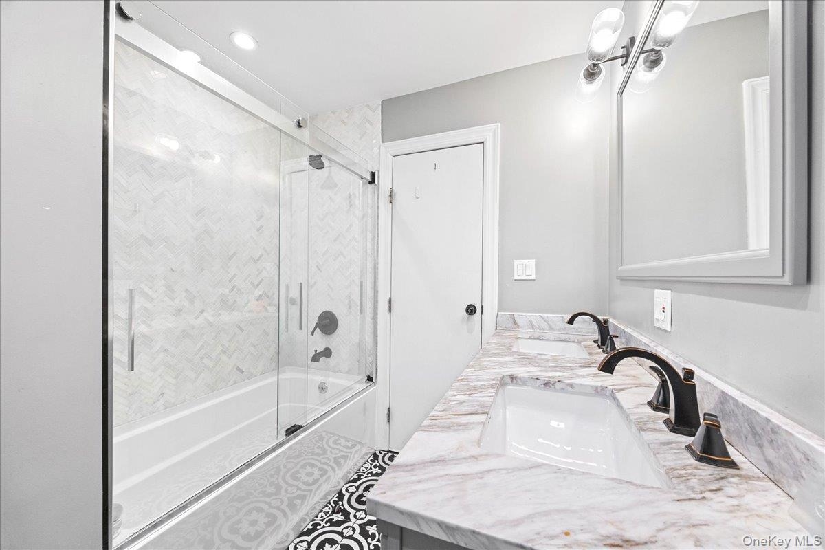 - Full bathroom featuring enclosed tub / shower combo and double vanity