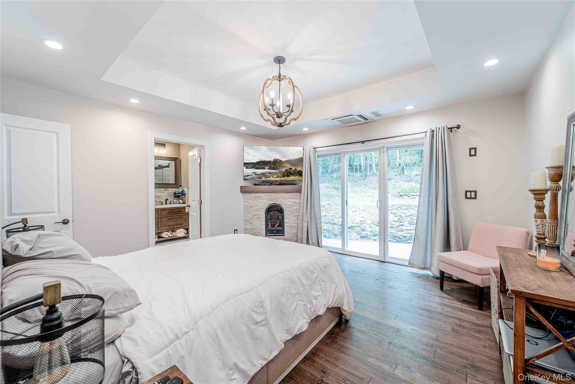 - Bedroom featuring a tray ceiling, access to exterior, a chandelier, recessed lighting, and wood finished floors