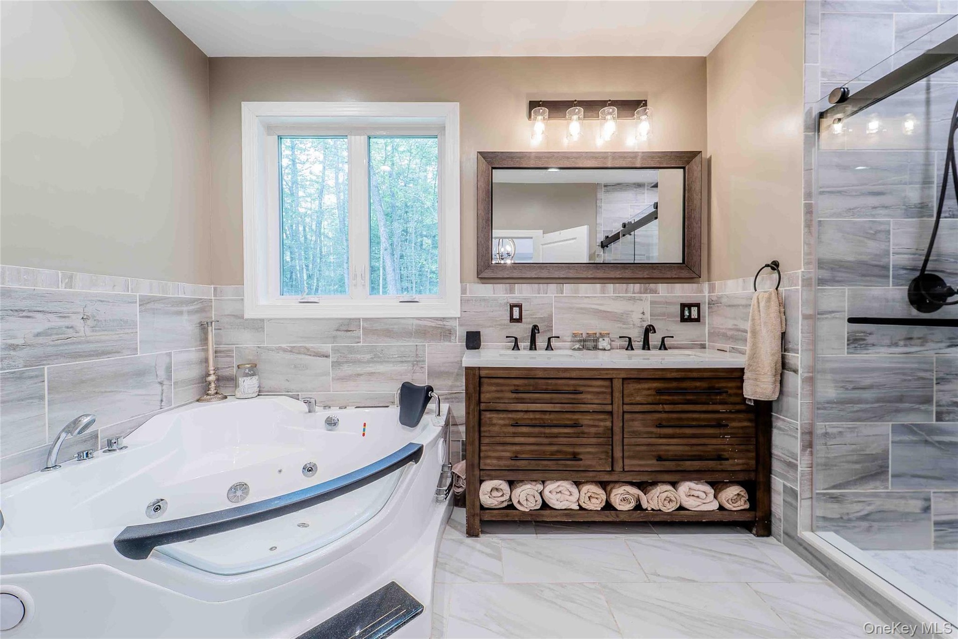 - Bathroom with tile walls, a jetted tub, double vanity, a stall shower, and marble finish floors