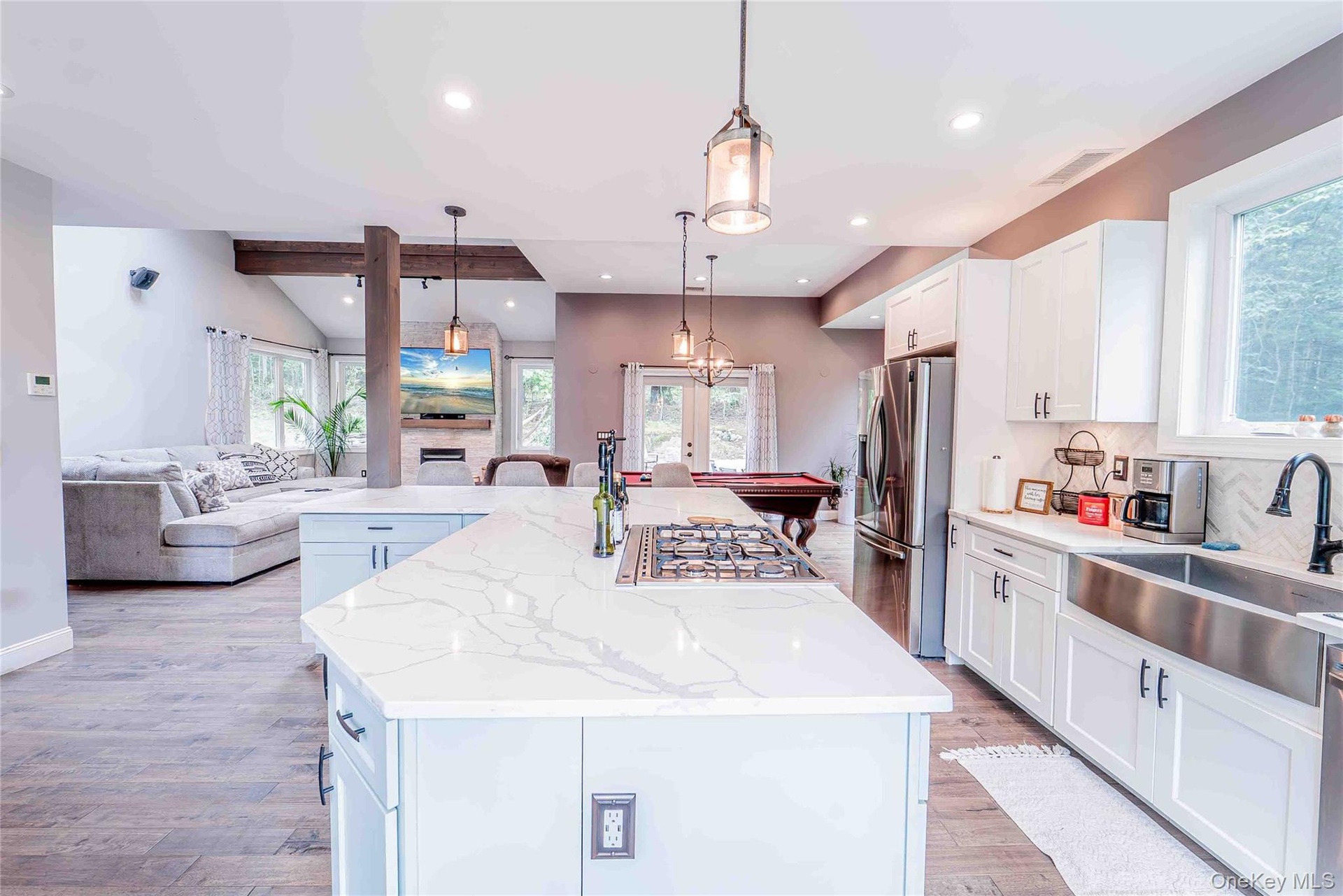 - Kitchen with stainless steel appliances, open floor plan, a fireplace, white cabinets, and light stone counters