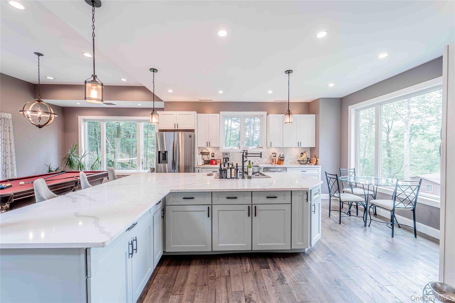 - Kitchen featuring stainless steel refrigerator with ice dispenser, wood finished floors, white cabinetry, a spacious island, and recessed lighting