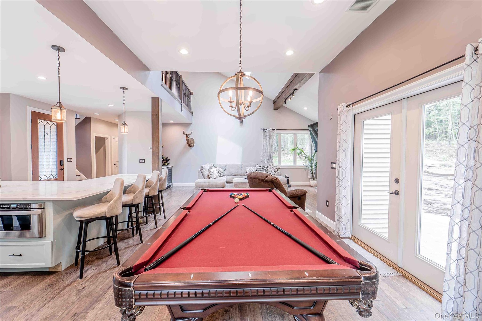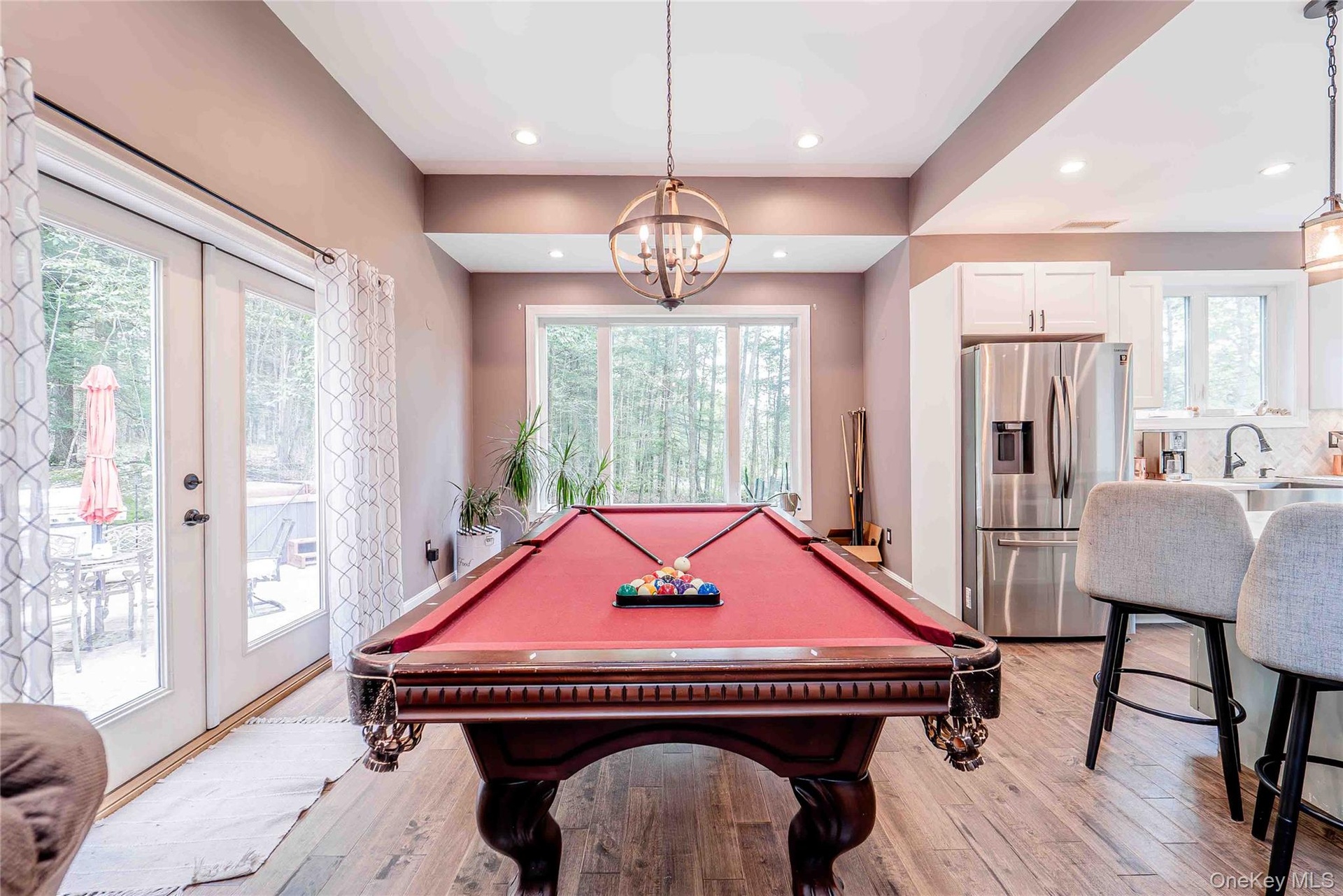 - Rec room with light wood-type flooring, recessed lighting, pool table, and a chandelier