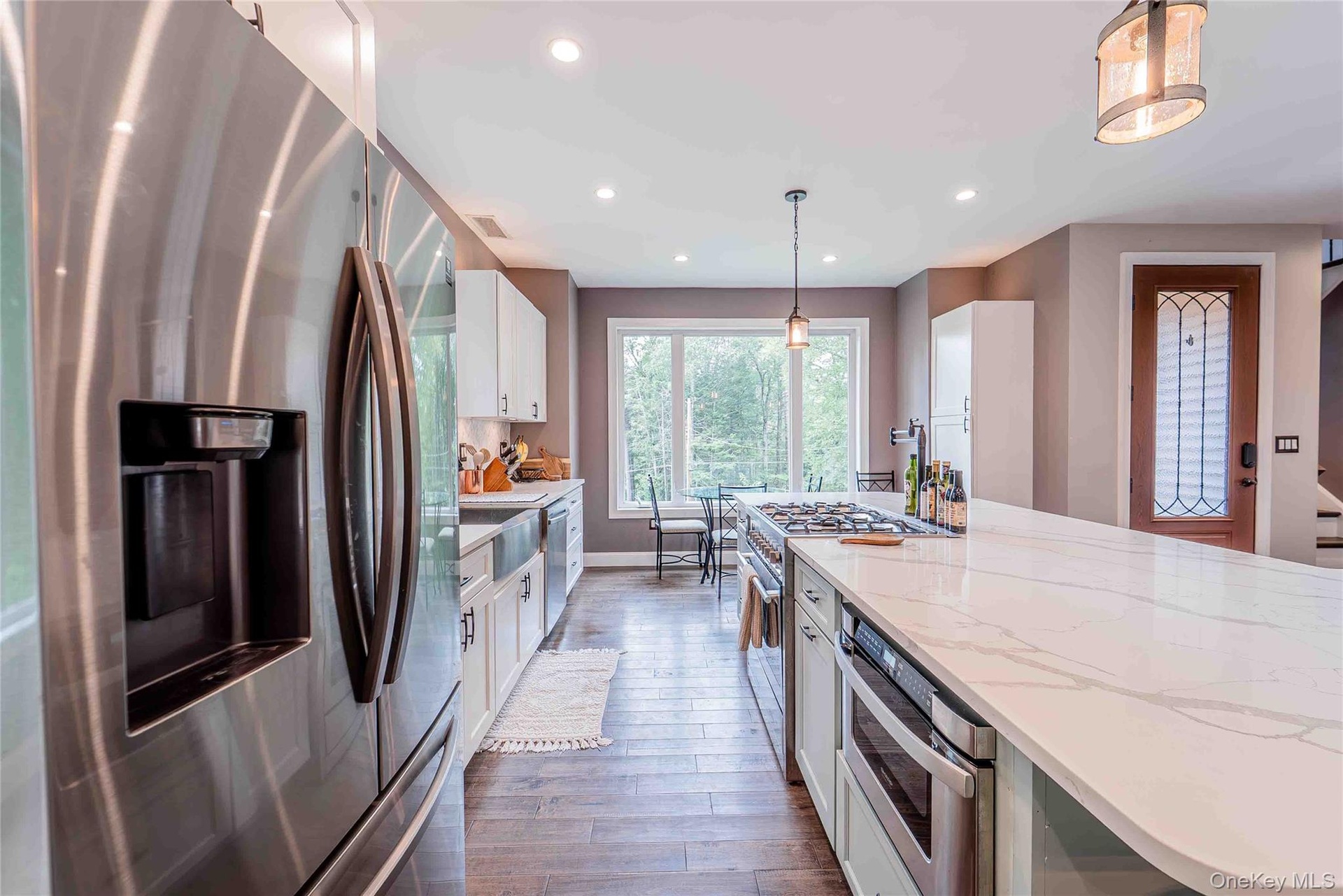 - Kitchen featuring appliances with stainless steel finishes, white cabinetry, dark wood-style flooring, light stone countertops, and pendant lighting