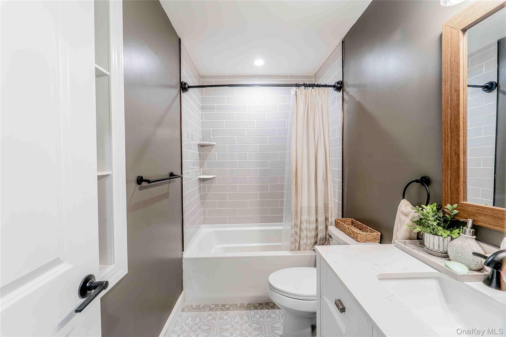 - Bathroom featuring vanity, shower / bathtub combination with curtain, and tile patterned flooring