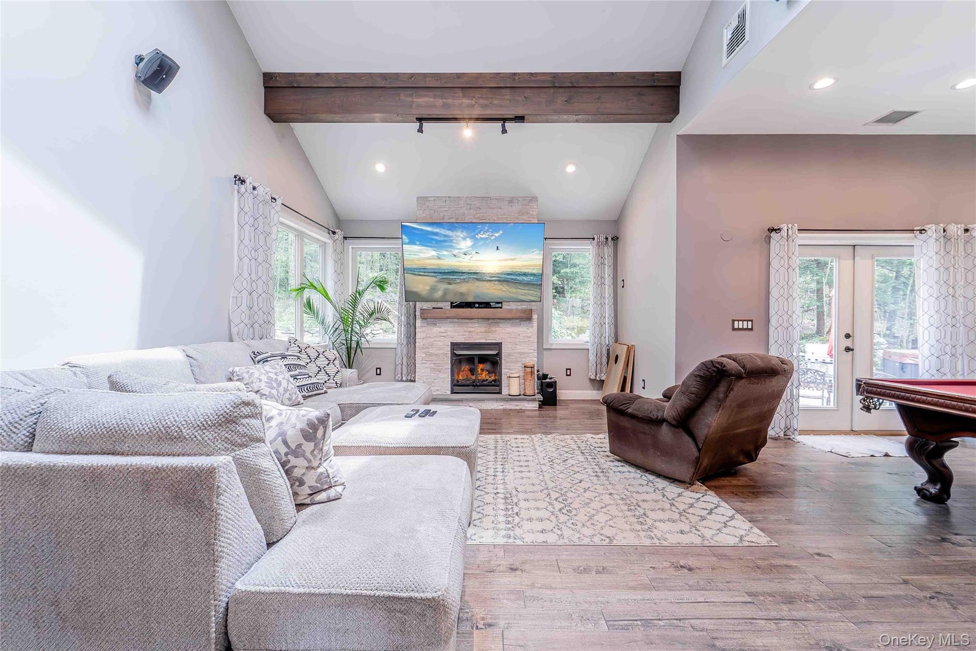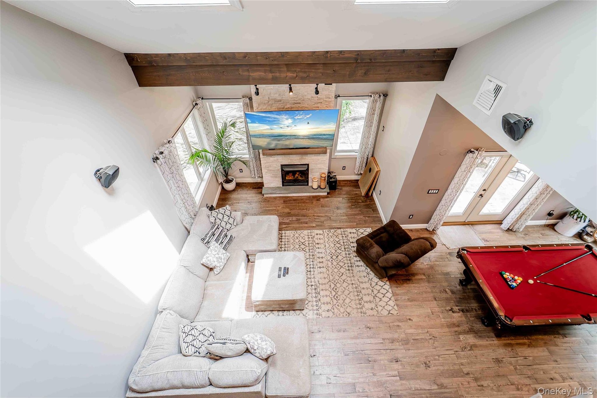 - Living area with beam ceiling, wood finished floors, healthy amount of natural light, billiards table, and a fireplace