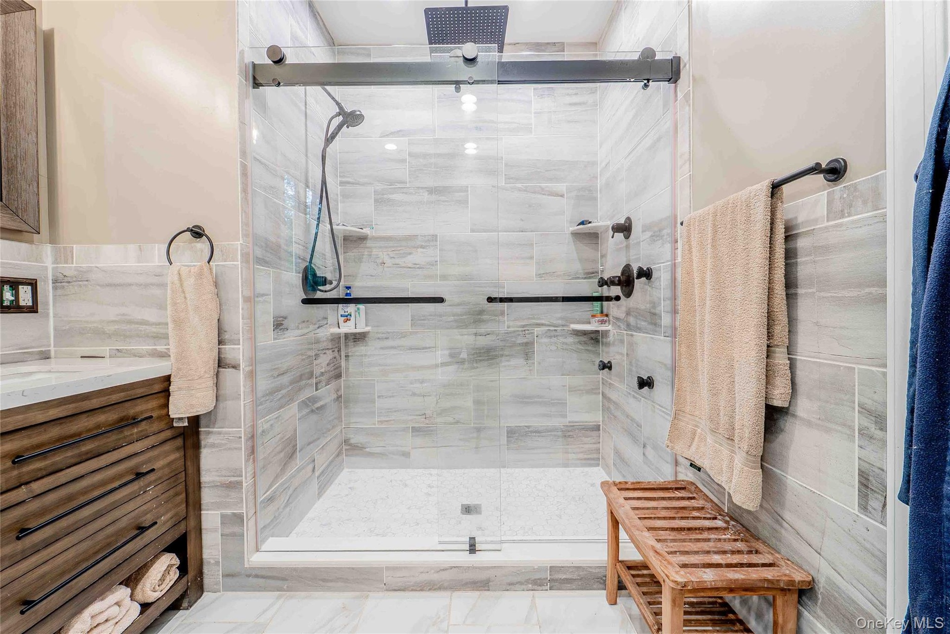 - Bathroom featuring a shower stall, vanity, and tile walls