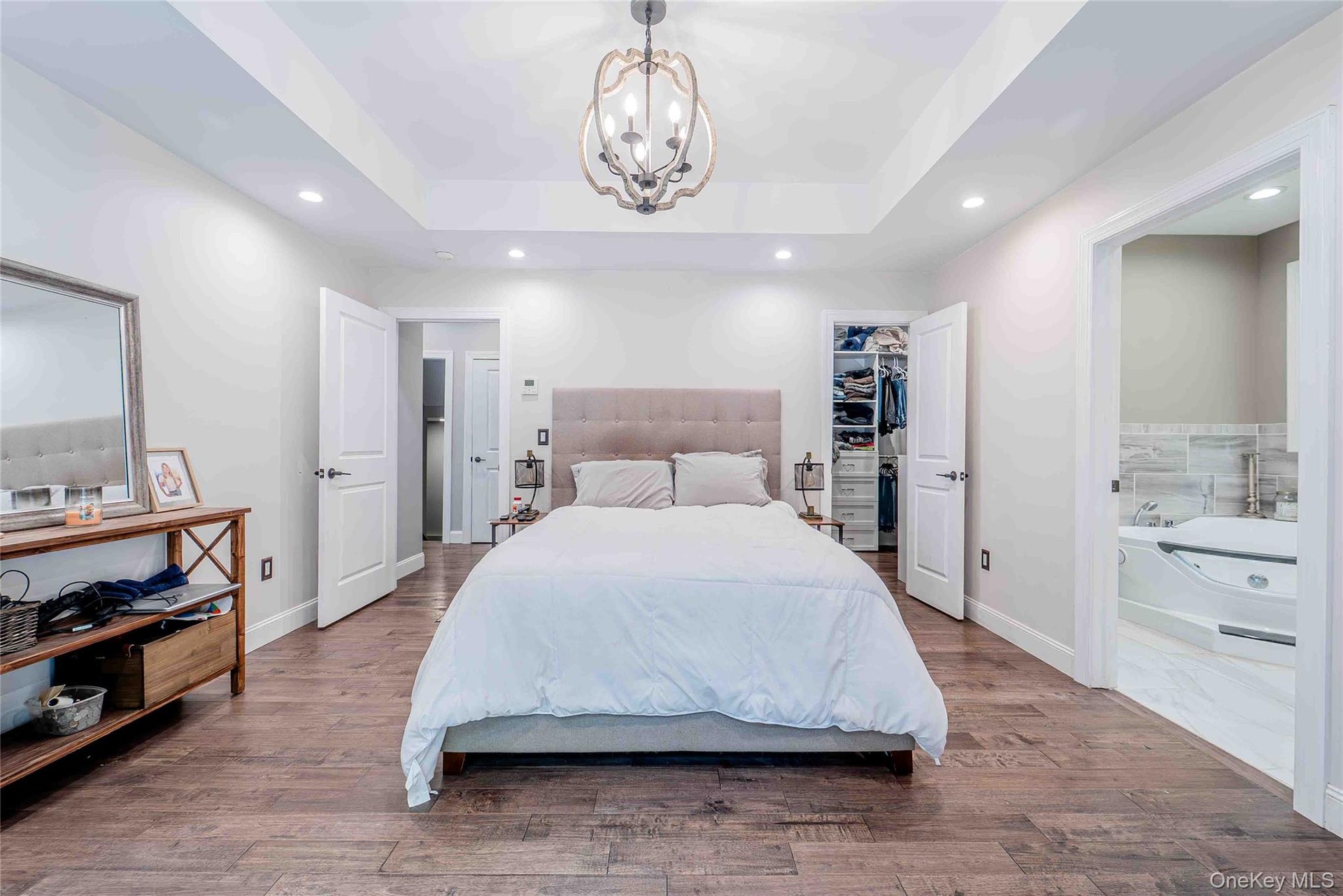 - Bedroom featuring a chandelier, wood finished floors, a walk in closet, recessed lighting, and a tray ceiling