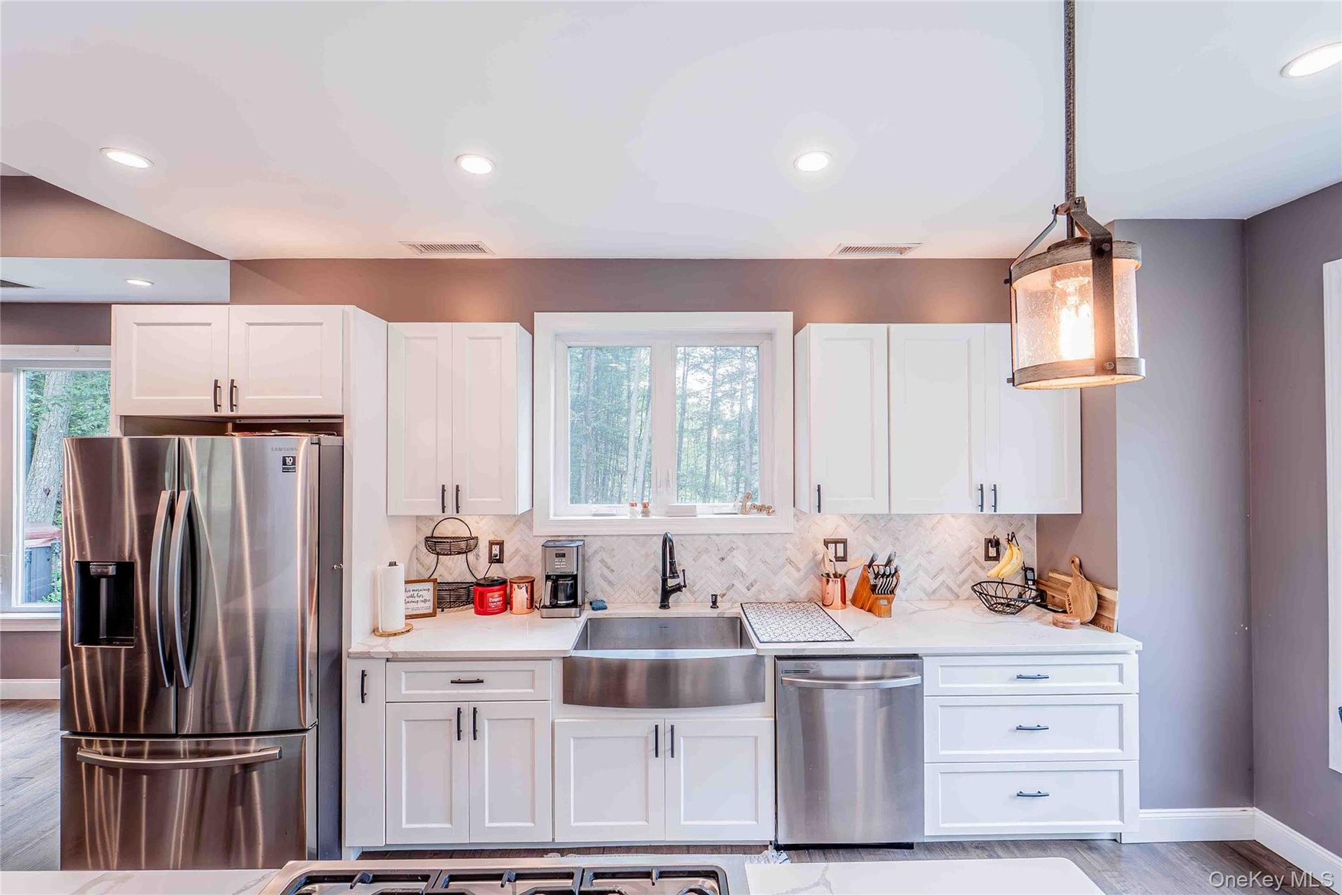 Welcome to 224 Lake Shore Drive, a turn-key lakeview retreat set on a peaceful 0.55-acre lot in a quiet neighborhood. This stunning newer construction home offers serene water views of Swinging Bridge Lake from nearly every window. Built in 2021, every detail of this residence feels fresh, modern, and thoughtfully designed for both comfort and style. Step inside to a bright, open main level featuring high ceilings, skylights, a fireplace, and generous entertaining space complete with a wet bar. The gourmet kitchen is a true showstopper, boasting striking quartz countertops, a huge island with a breakfast bar, a built-in oven, and abundant cabinetry. The main-level primary suite is a private sanctuary, featuring an additional fireplace, walk-in closet, and an ensuite bath with double vanity, Jacuzzi tub, and separate shower. A hallway, half-bath, and laundry area add convenience. Upstairs, you'll find a loft-like setup overlooking the living area, two additional bedrooms, a full bathroom, and a bonus playroom branching off one of the bedrooms, perfect for a home office, game room, or creative space. With a new roof, siding, appliances, and utilities, this home is move-in ready. Just 15 minutes to Highway 17 and 90 minutes from NYC, this is an ideal escape or full-time residence. Whether you’re enjoying morning coffee by the water or hosting weekend getaways, 224 Lake Shore Drive is the lifestyle upgrade you’ve been waiting for. Call today to schedule your private showing!