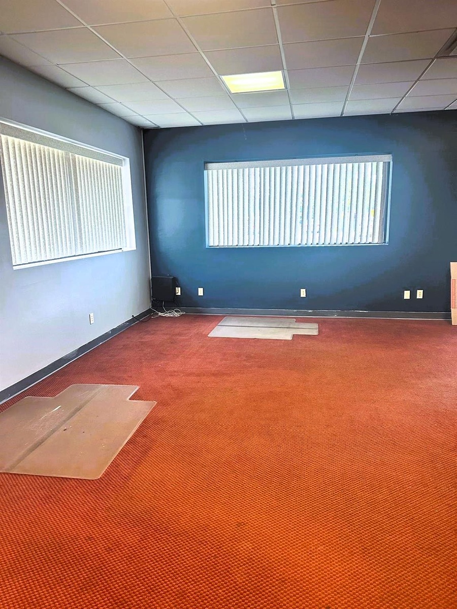 - Carpeted empty room featuring a drop ceiling and baseboards