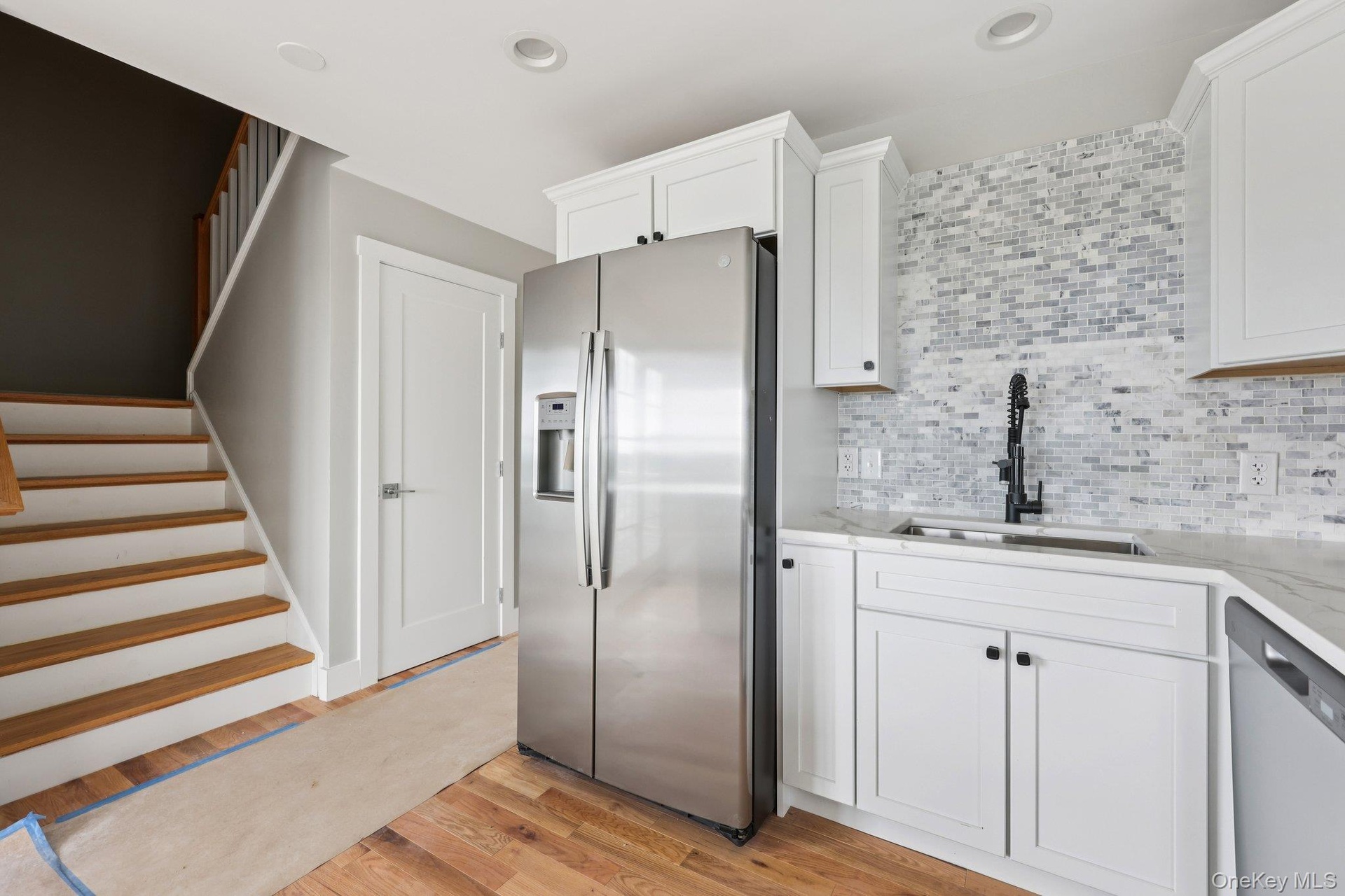 - Kitchen featuring stainless steel appliances, light wood finished floors, light countertops, and backsplash