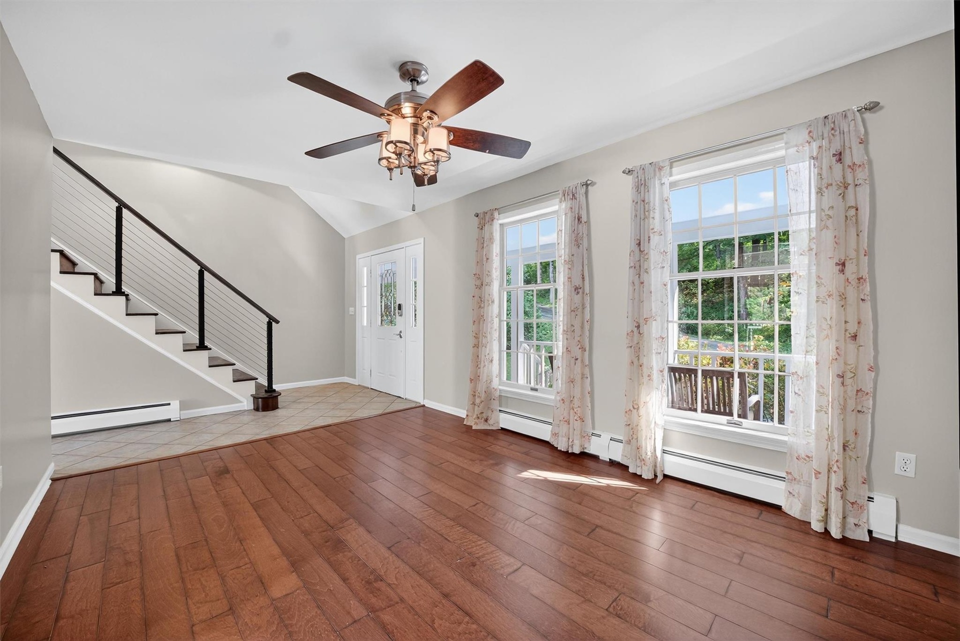 - Entrance foyer featuring a baseboard heating unit, wood-type flooring, stairs, ceiling fan, and lofted ceiling