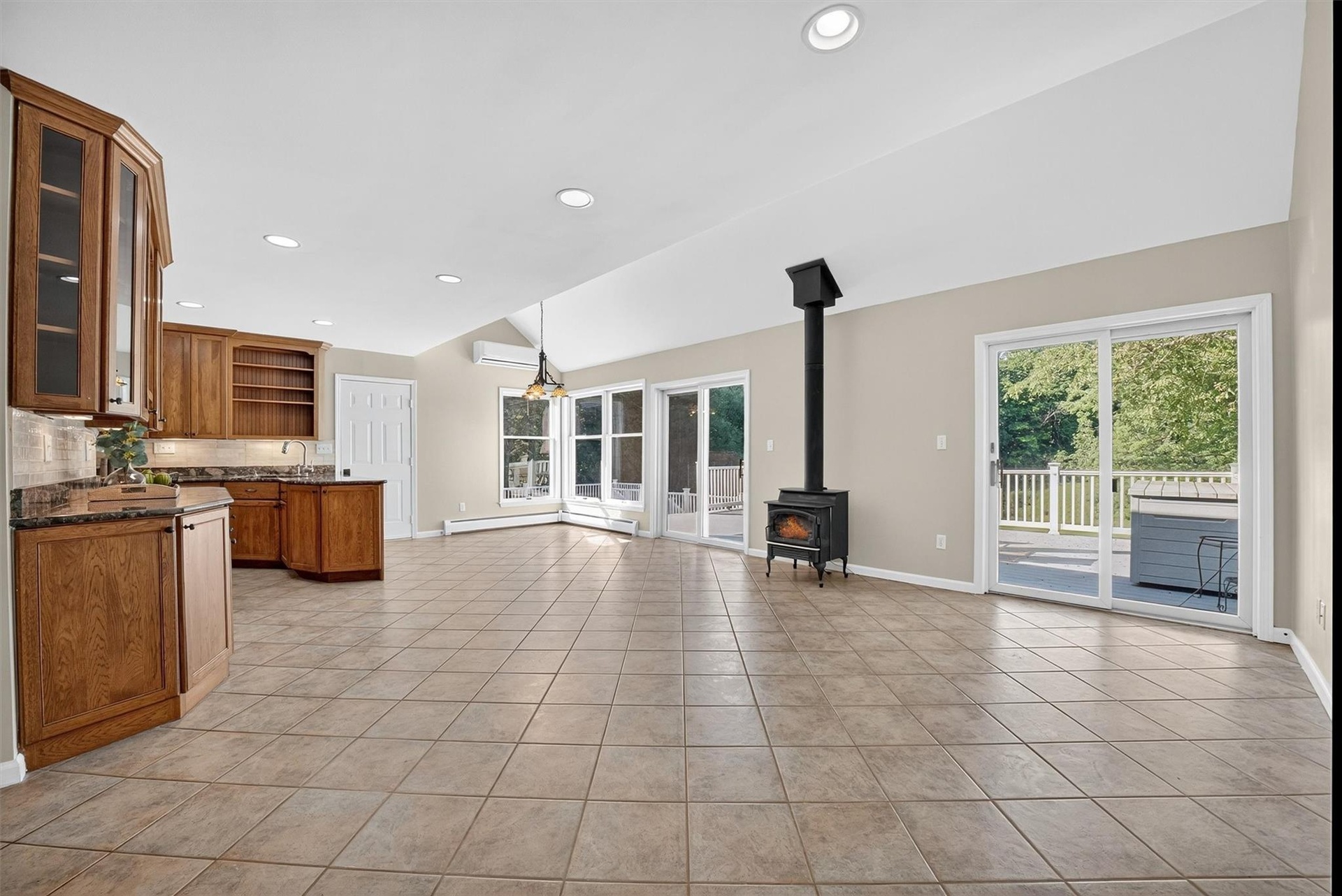 - Living area featuring light tile patterned Vir floors, a wood stove, healthy amount of natural light, lofted ceiling, and recessed lighting Virtually