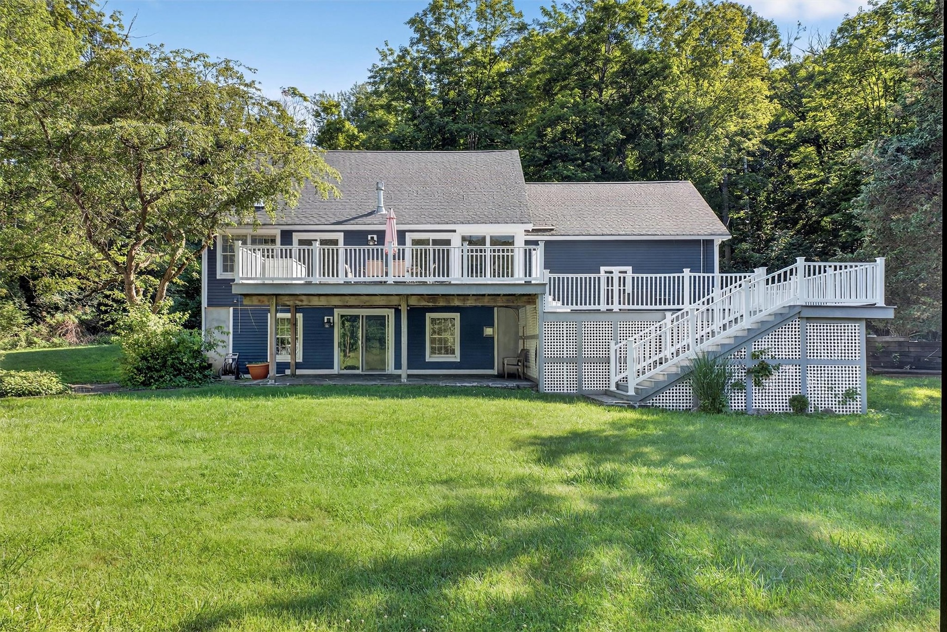 - View of grassy yard with a wooden deck and stairs