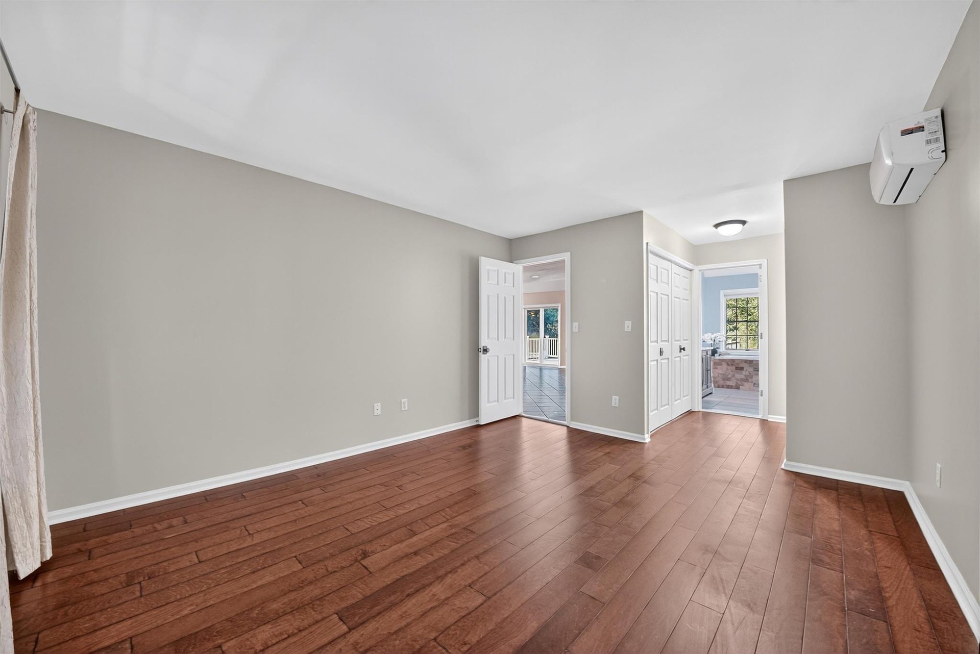 - Empty room featuring a wall unit AC and dark wood-style floors