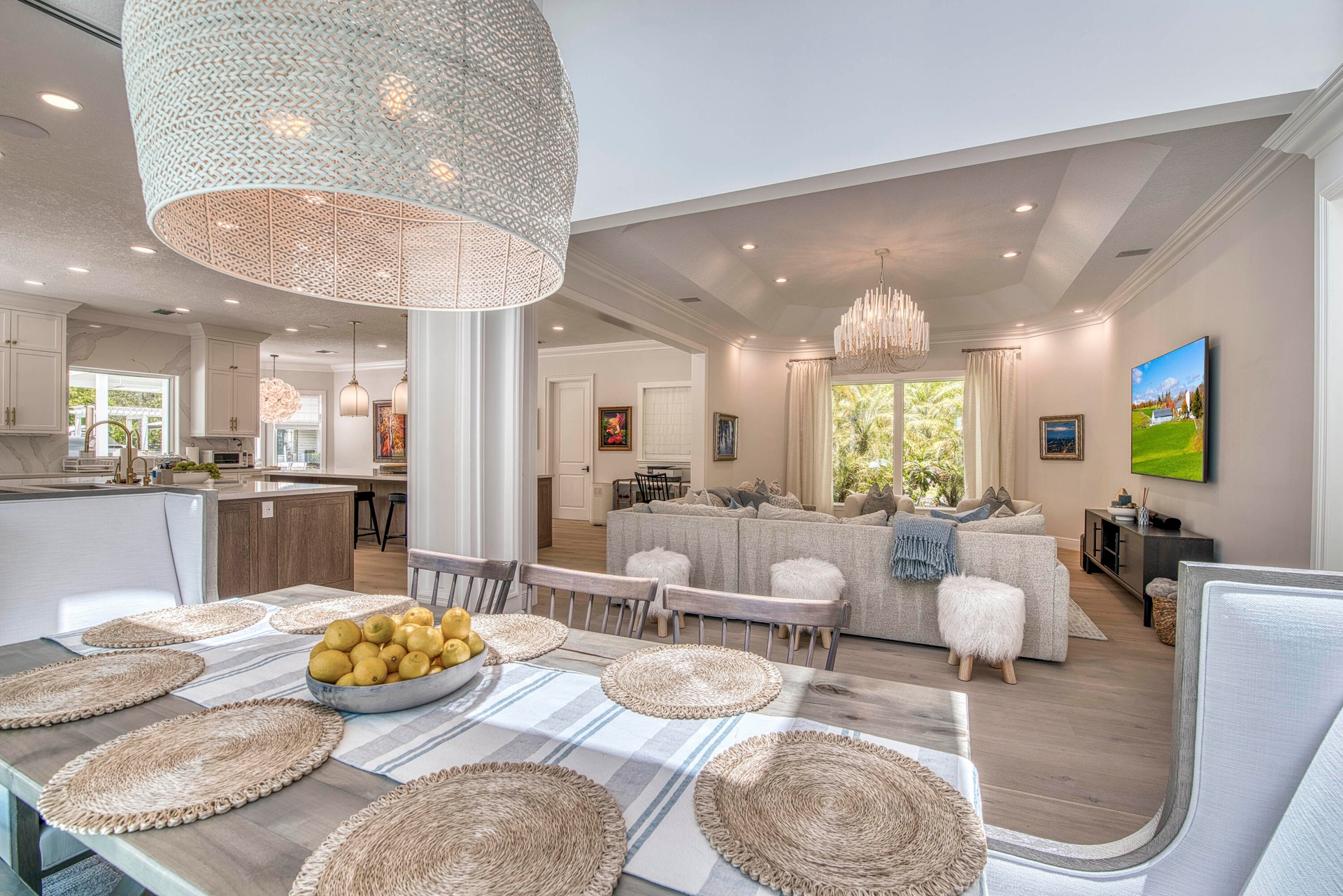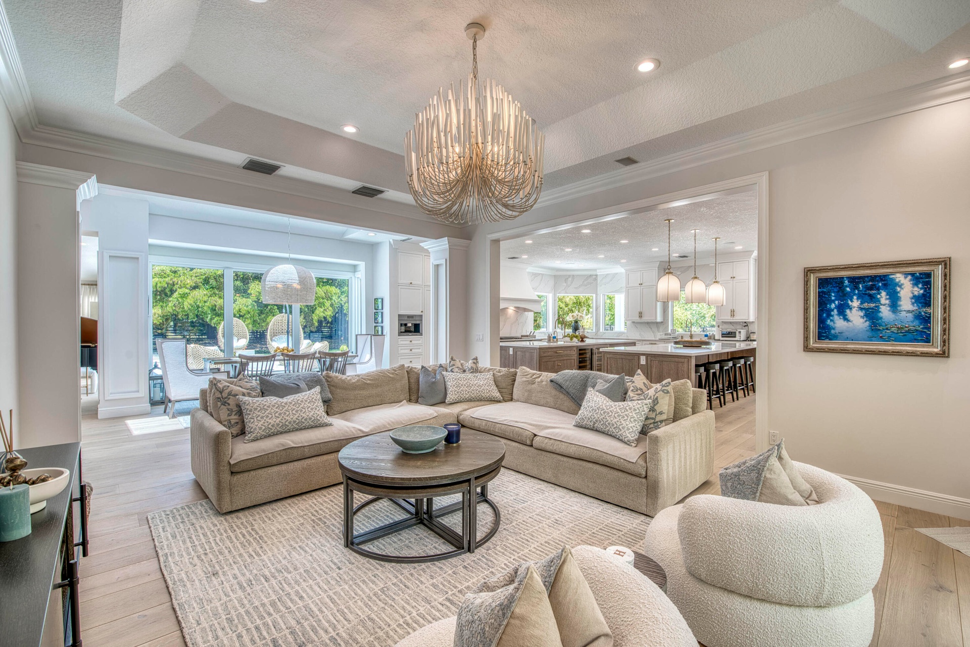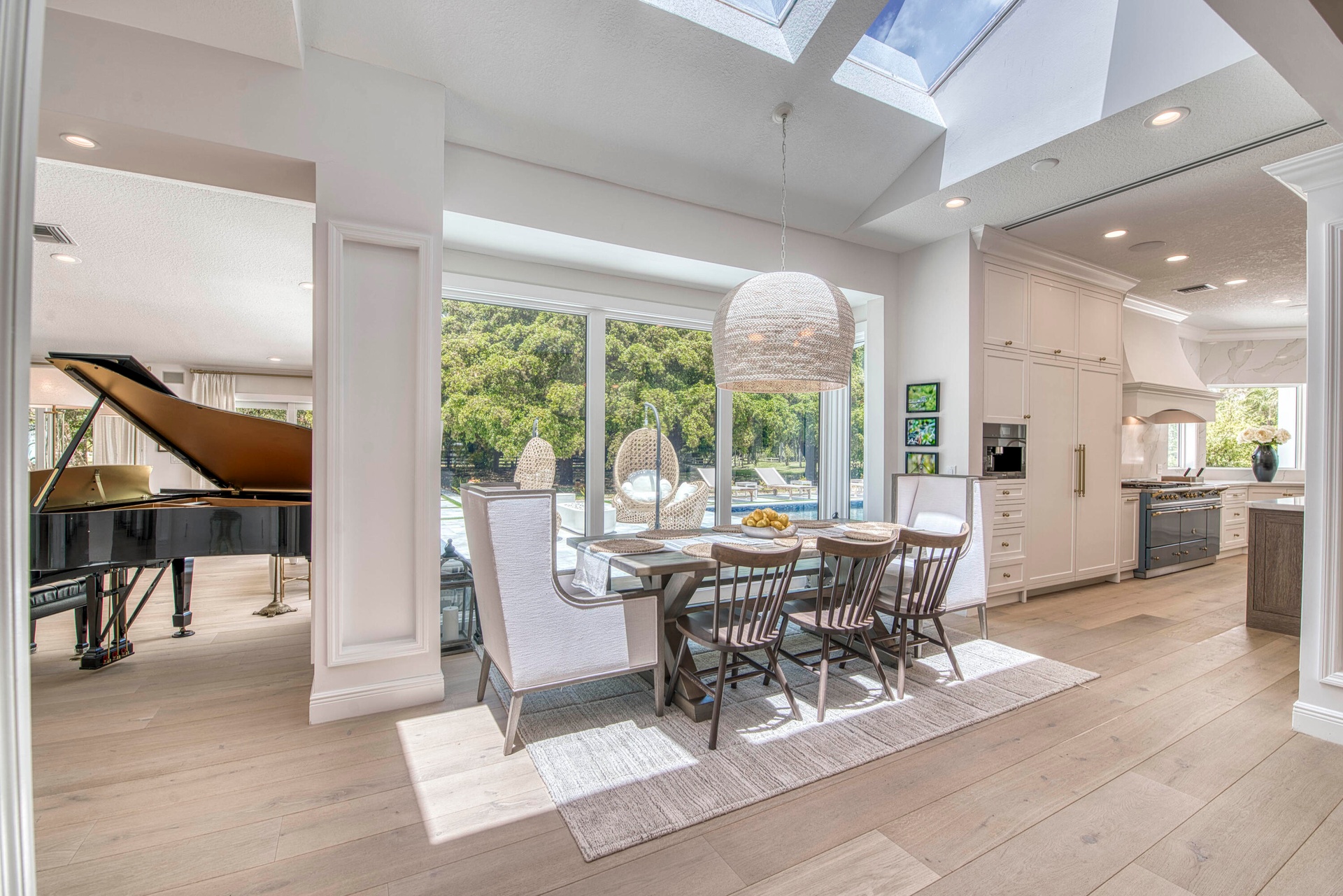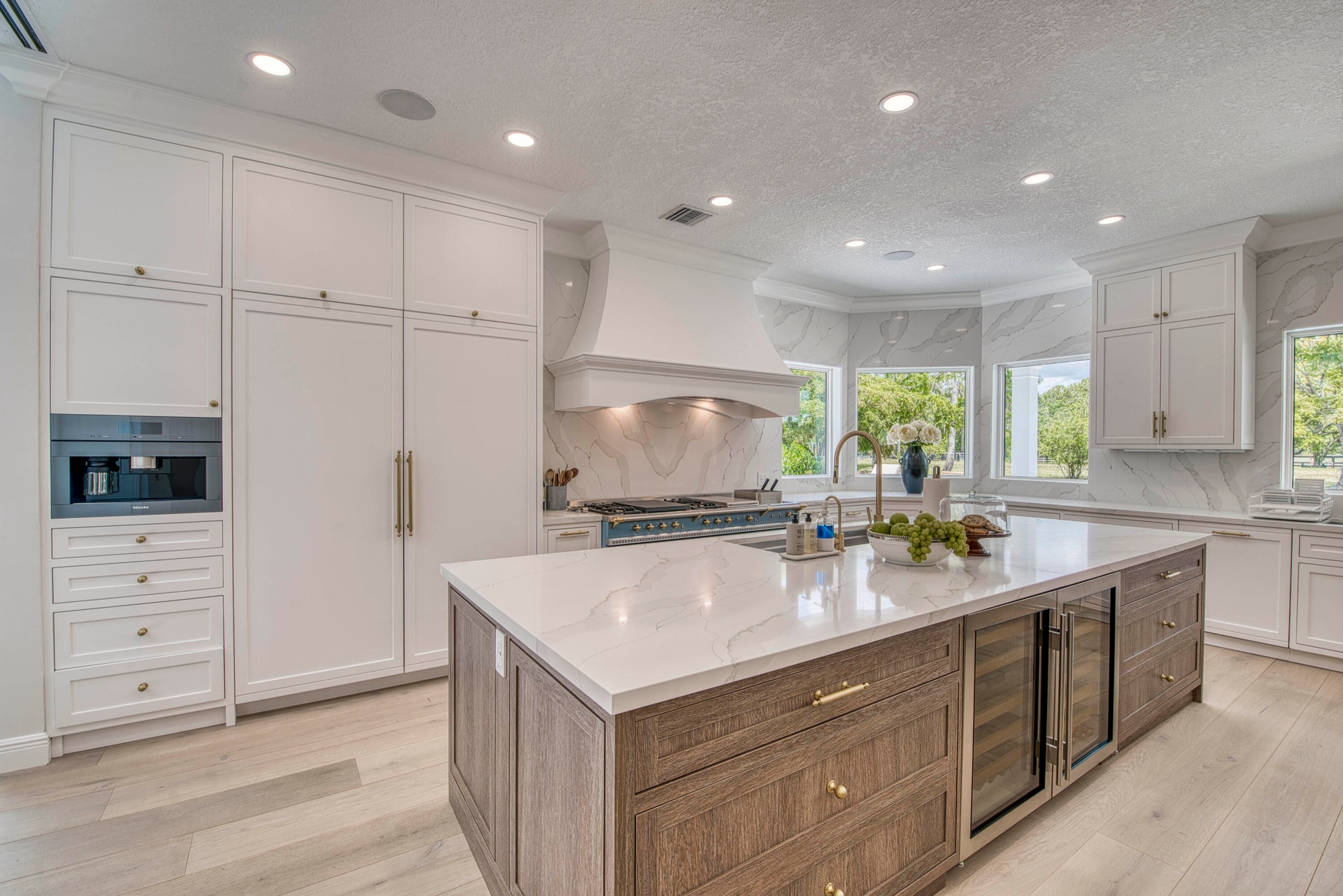 Escape to your private South Florida sanctuary, a modern French Country estate that redefines refined living on over five acres of lush, equestrian land. Here, tranquility, craftsmanship, and contemporary luxury coexist in perfect balance. Every inch of this estate has been thoughtfully redesigned, blending timeless European charm with the ease of contemporary luxury living. From the moment you arrive along the long private drive, the home reveals its elegance through vaulted, skylit ceilings, walls of glass, and wide-plank European oak flooring that flood each space with natural light. The heart of the home is the show-stopping chef's kitchen, anchored by dual oversized islands, quartz countertops, and ceiling-height custom cabinetry. A statement wood hood crowns the professional