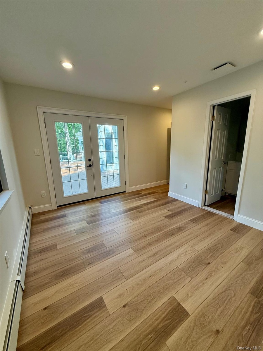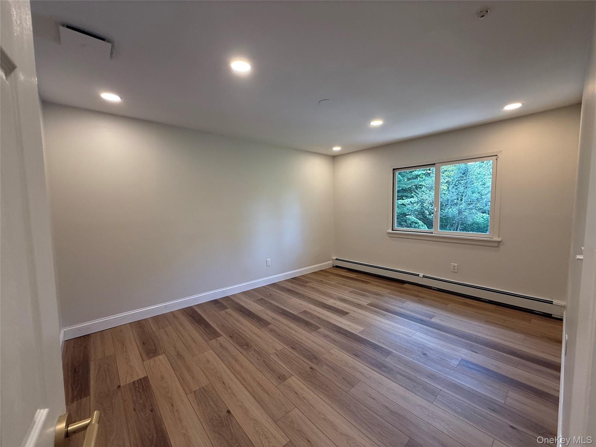 - Unfurnished room with a baseboard radiator, wood finished floors, and recessed lighting
