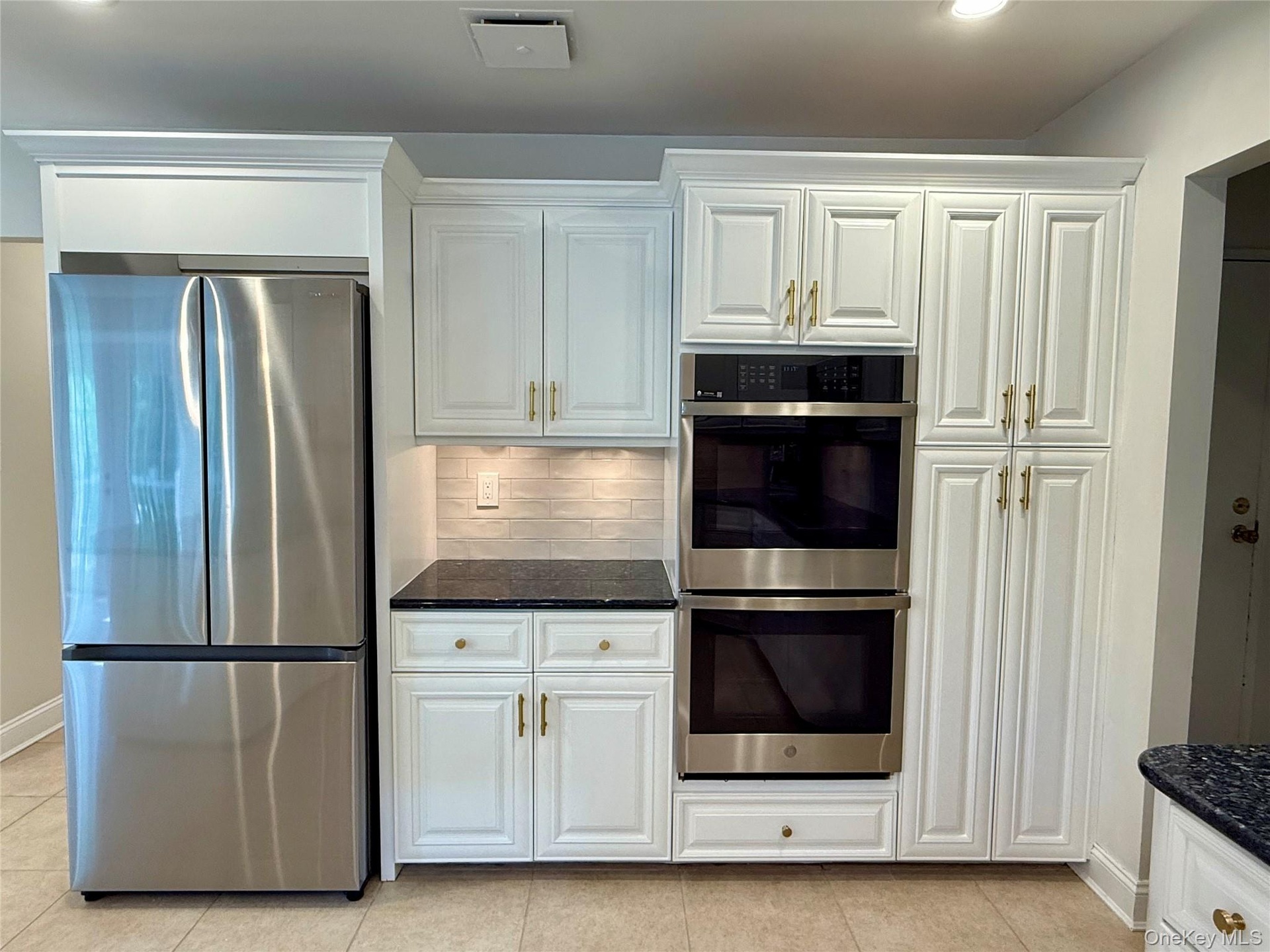 - Kitchen featuring appliances with stainless steel finishes, light tile patterned floors, white cabinetry, and tasteful backsplash