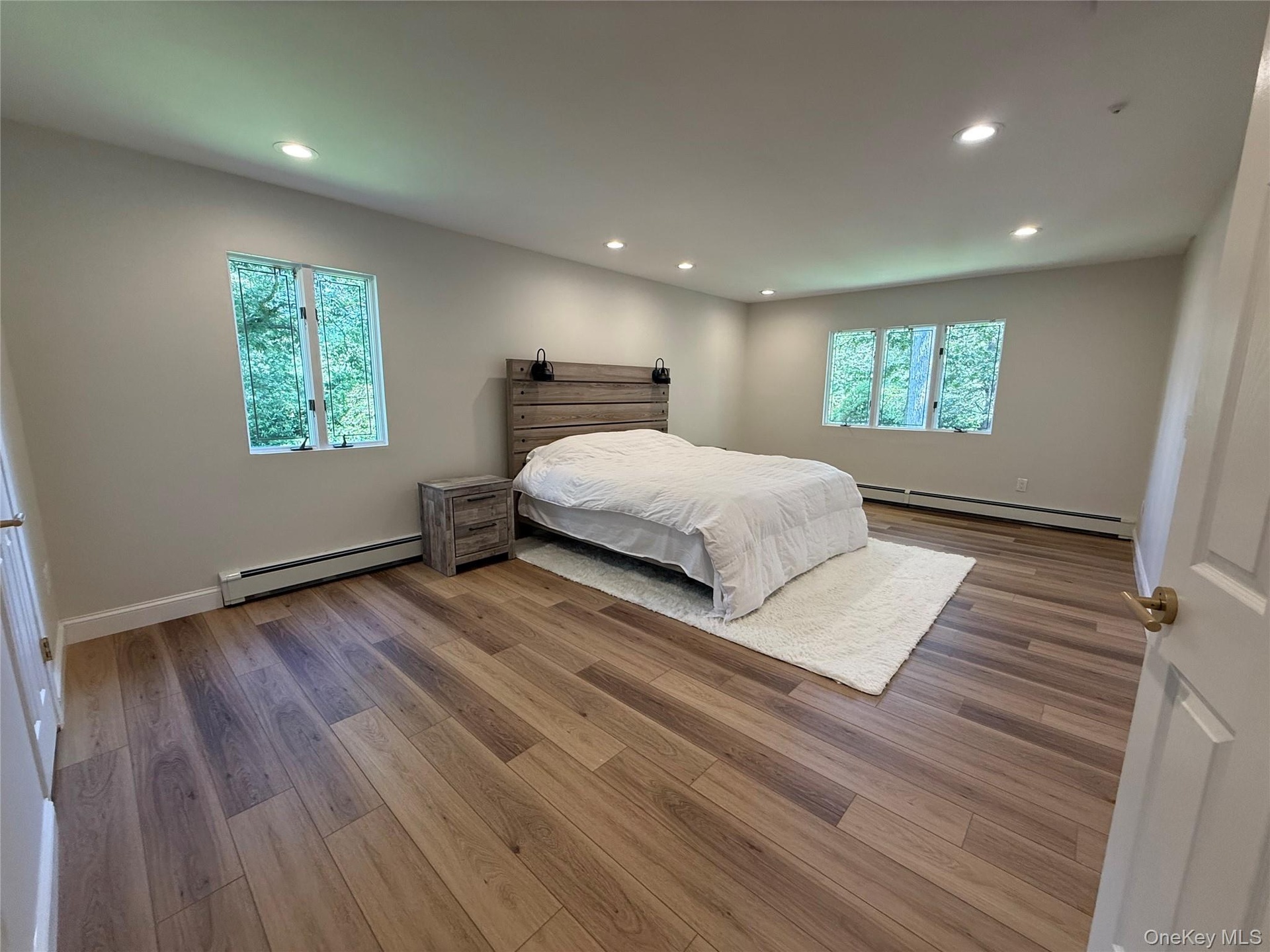 - Bedroom with baseboard heating, recessed lighting, and wood finished floors