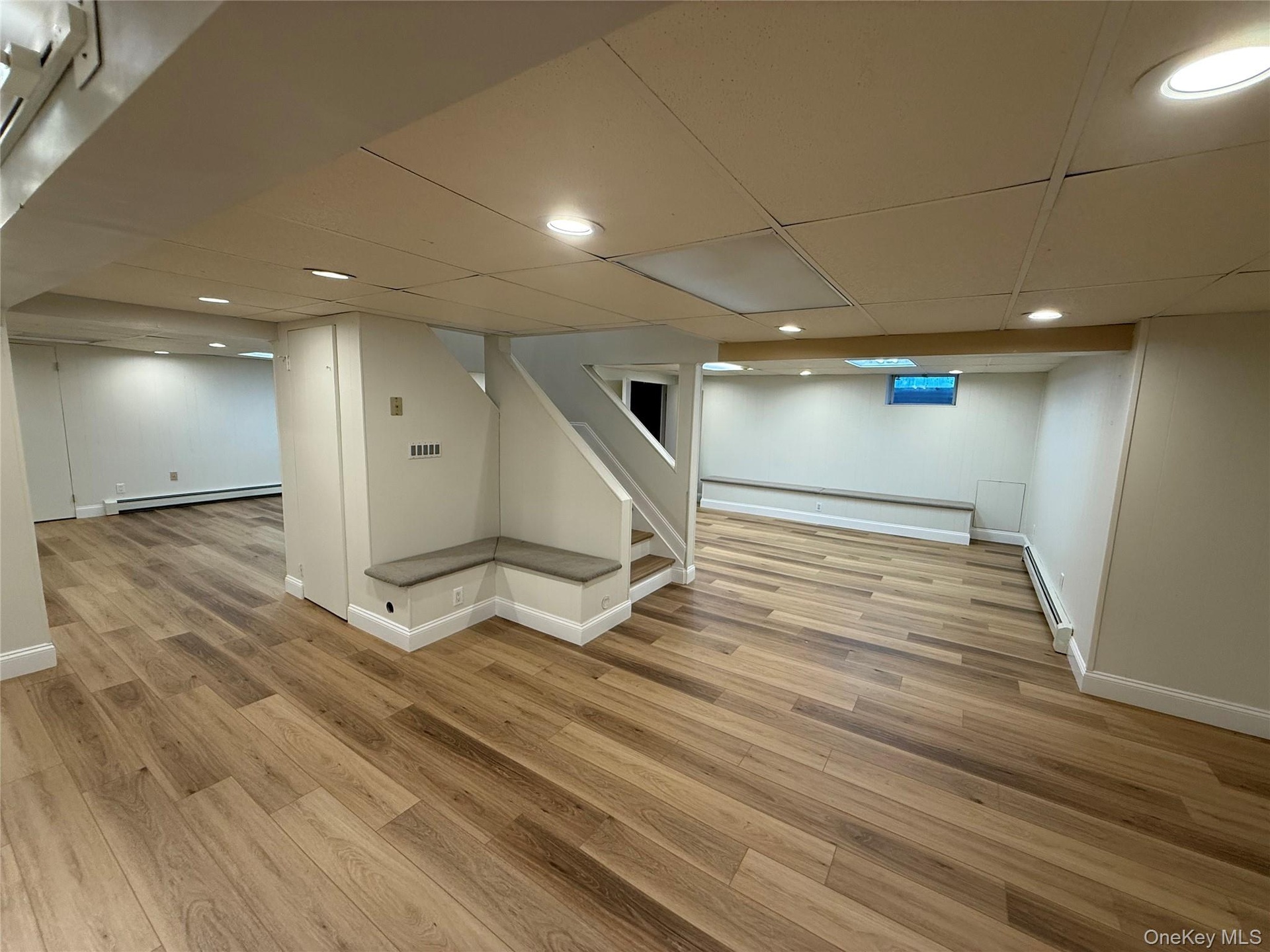 - Finished basement featuring baseboard heating, stairs, wood finished floors, a paneled ceiling, and recessed lighting