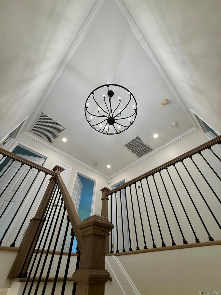 - Stairway featuring crown molding, a chandelier, and recessed lighting