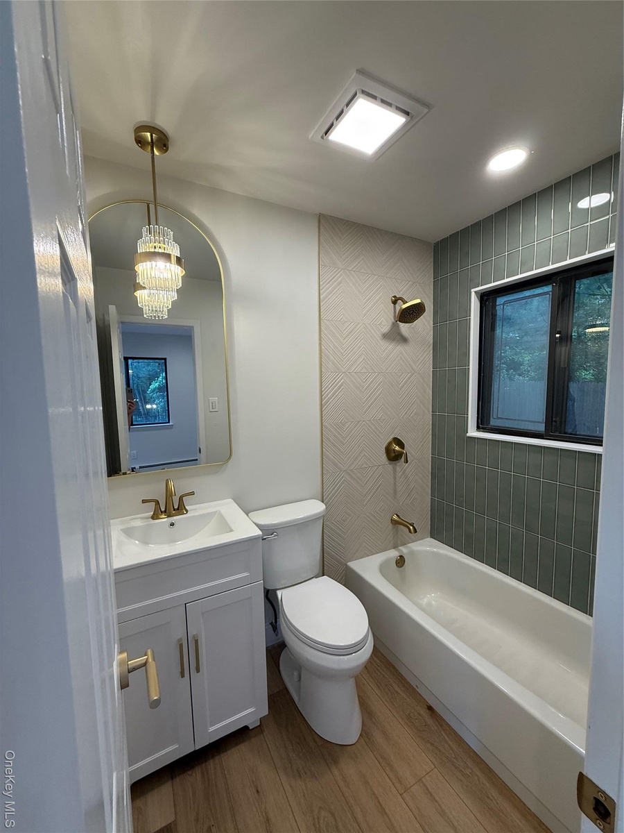 - Full bathroom with vanity, wood finished floors, a chandelier, and bathing tub / shower combination