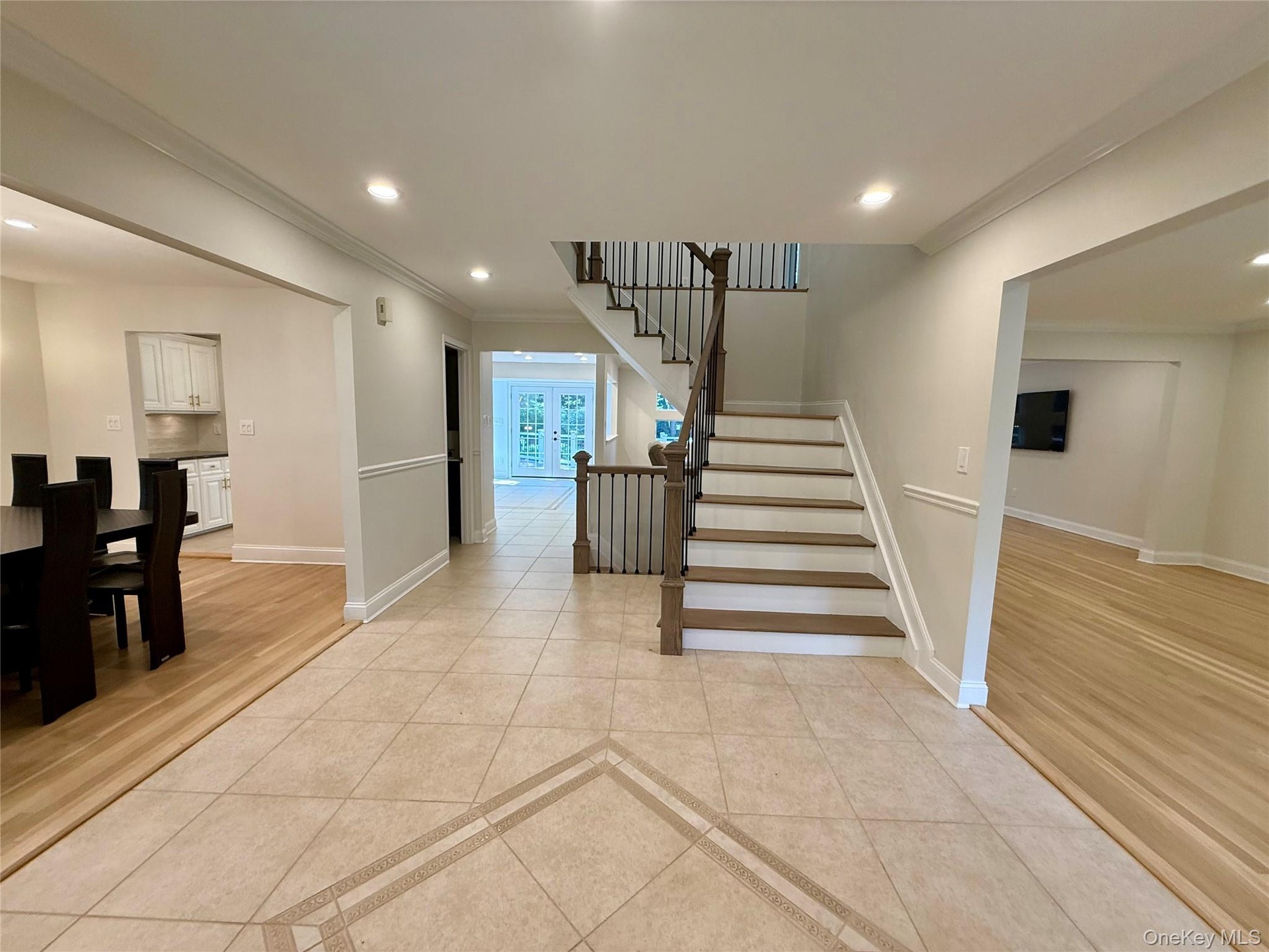 - Stairway featuring ornamental molding, tile patterned floors, and recessed lighting