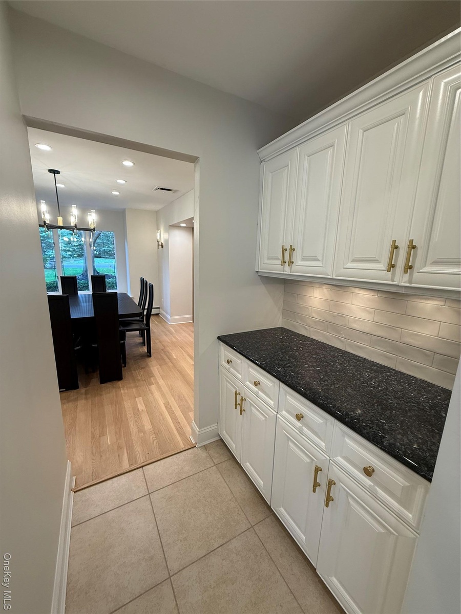 - Kitchen with white cabinetry, tasteful backsplash, light tile patterned flooring, dark stone countertops, and recessed lighting