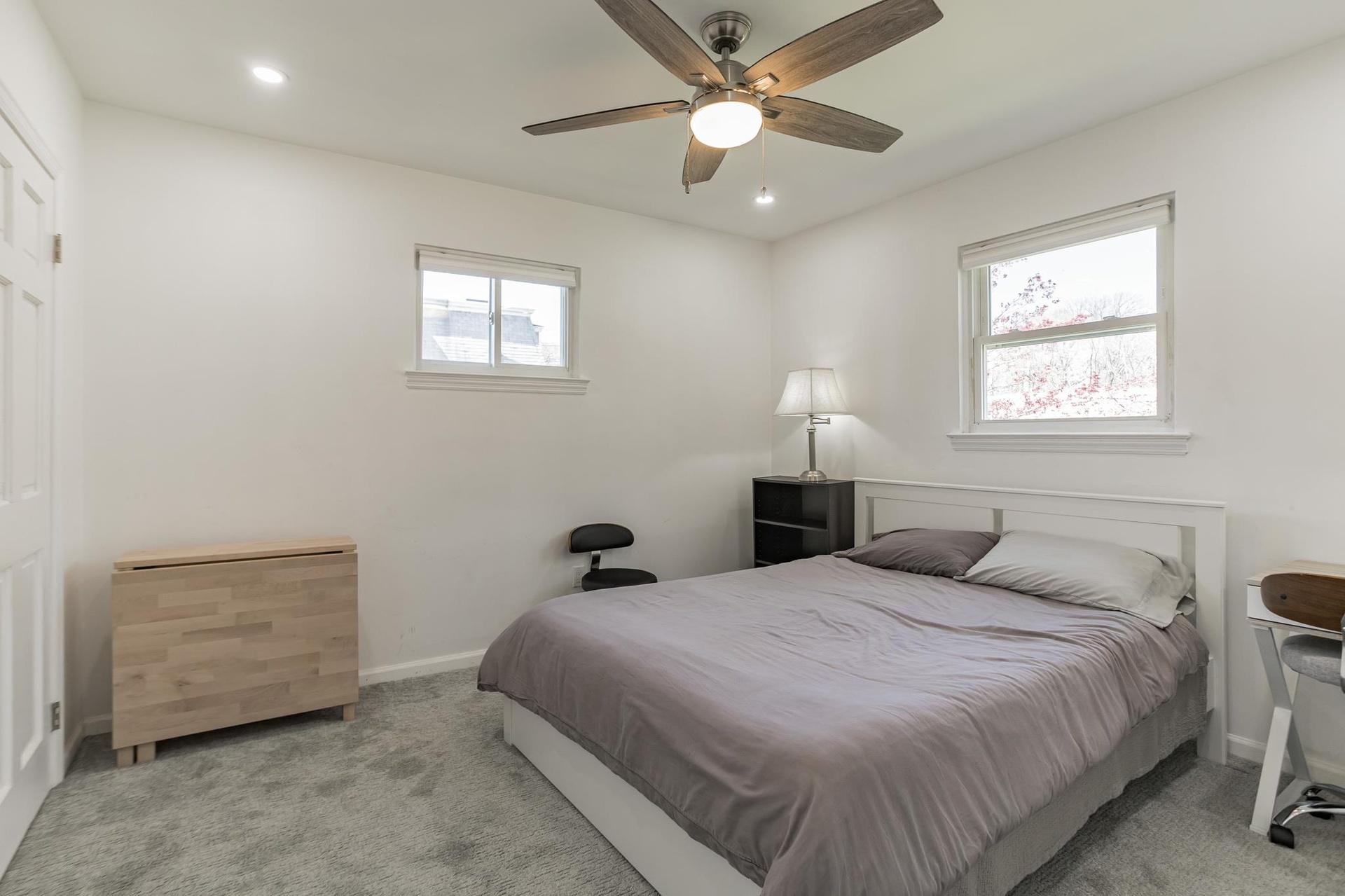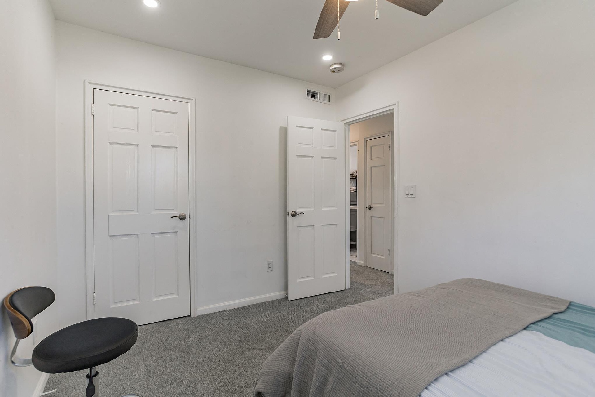 - Bedroom with carpet floors, recessed lighting, and ceiling fan