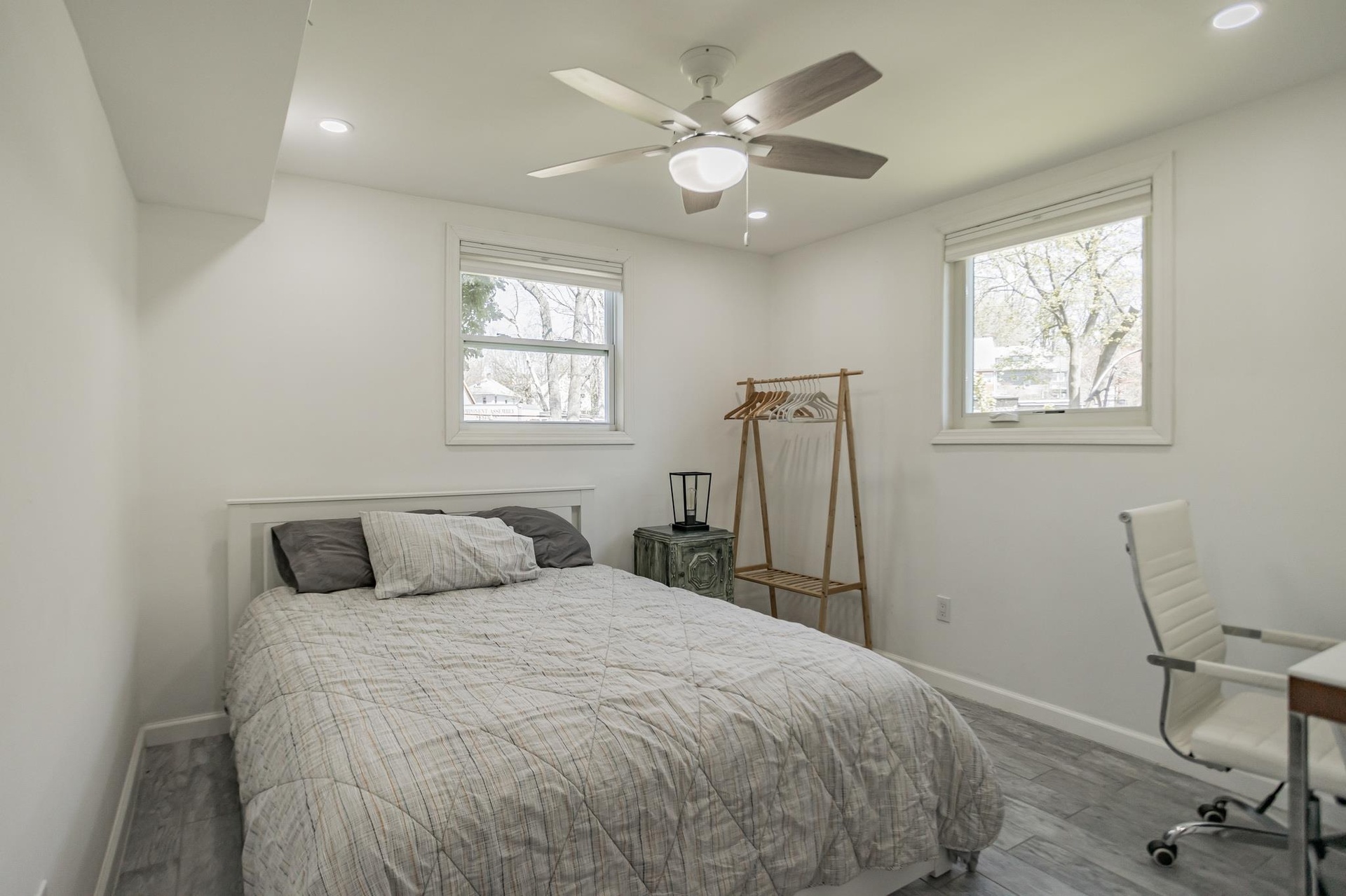 - Bedroom featuring recessed lighting, wood finished floors, and ceiling fan