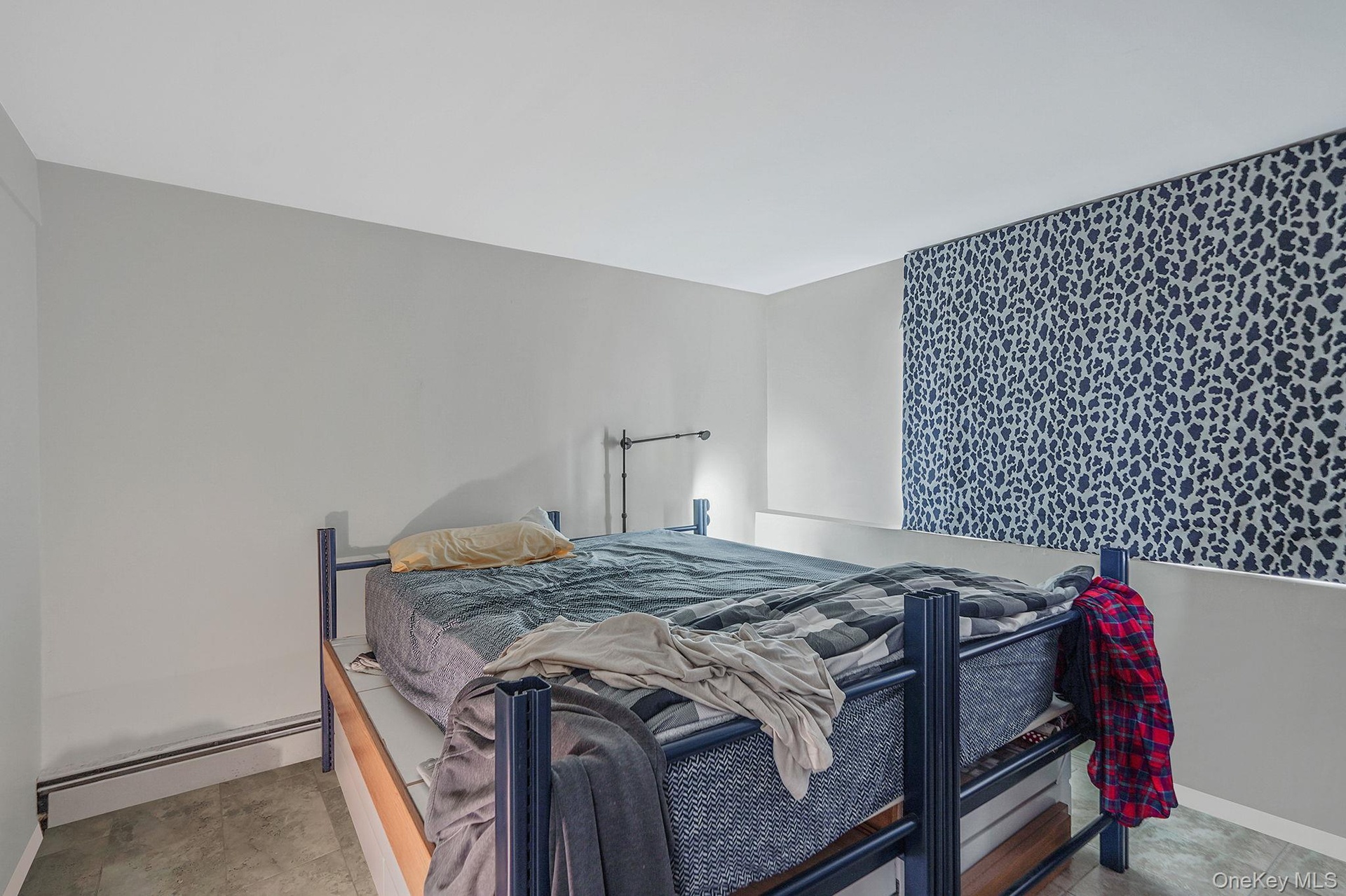 - Bedroom featuring light wood finished floors, a baseboard heating unit, and recessed lighting
