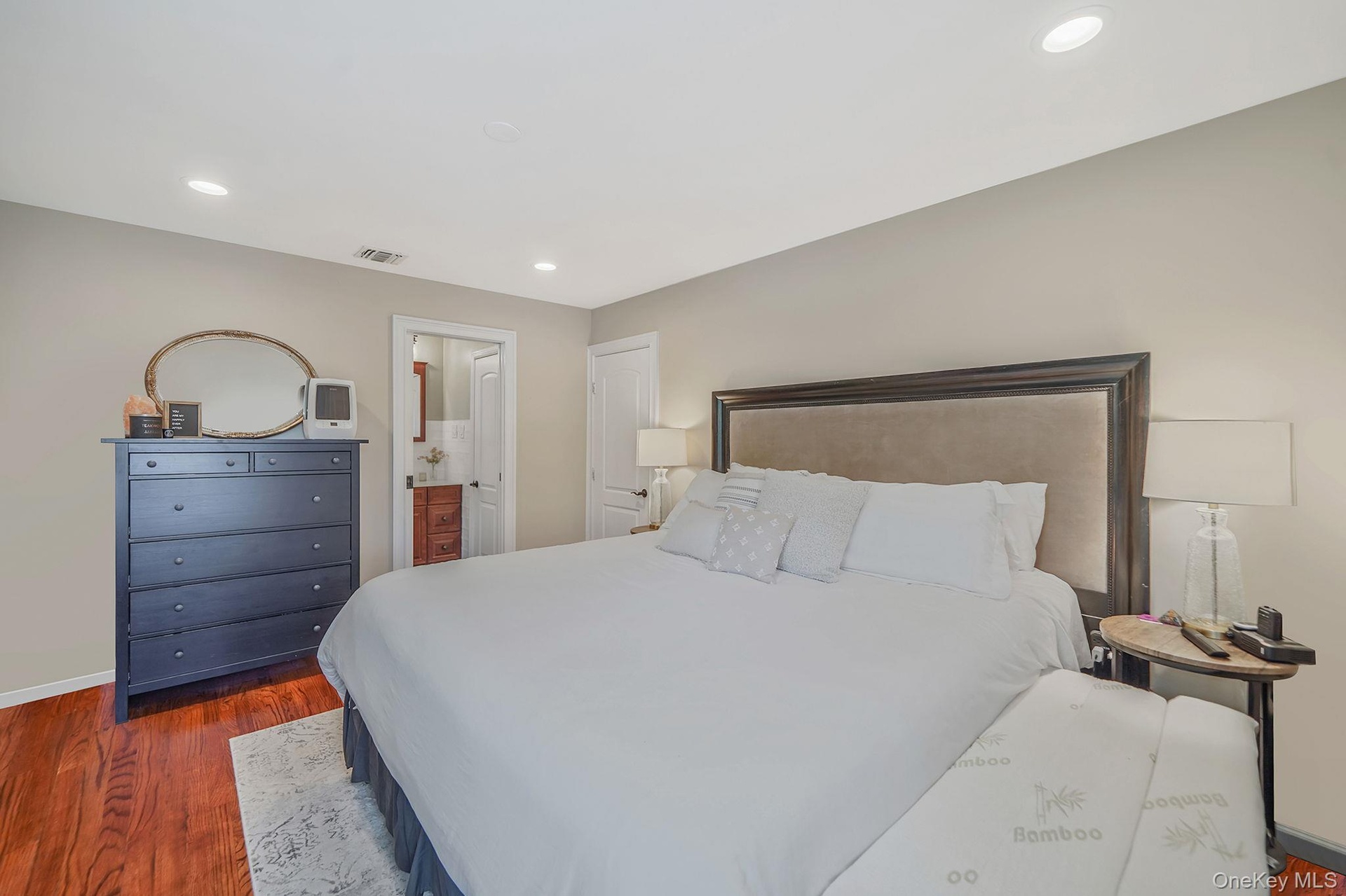 - Bedroom with dark wood-style floors, recessed lighting, and ensuite bath