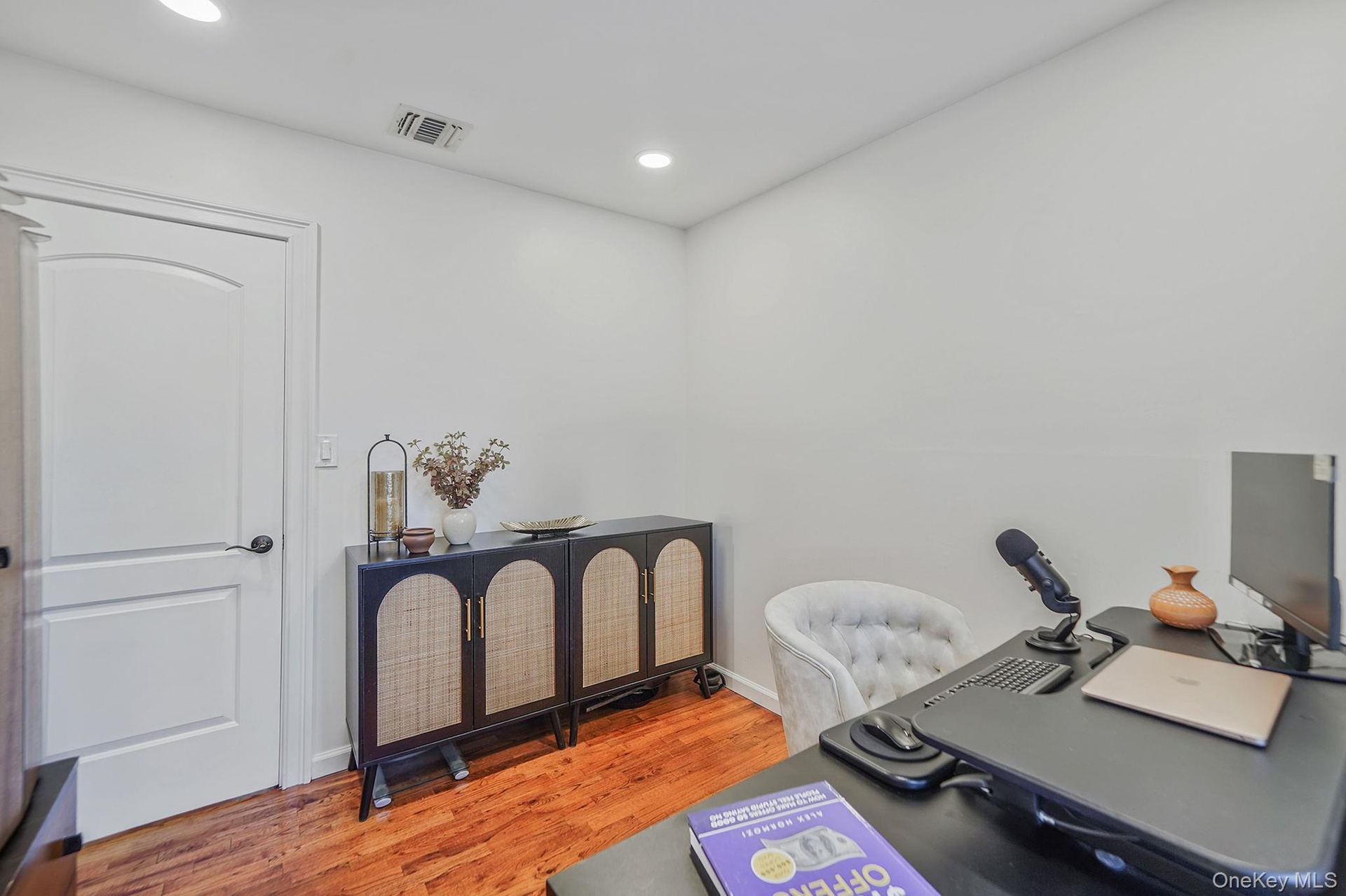 - Home office with wood finished floors, a baseboard heating unit, and recessed lighting