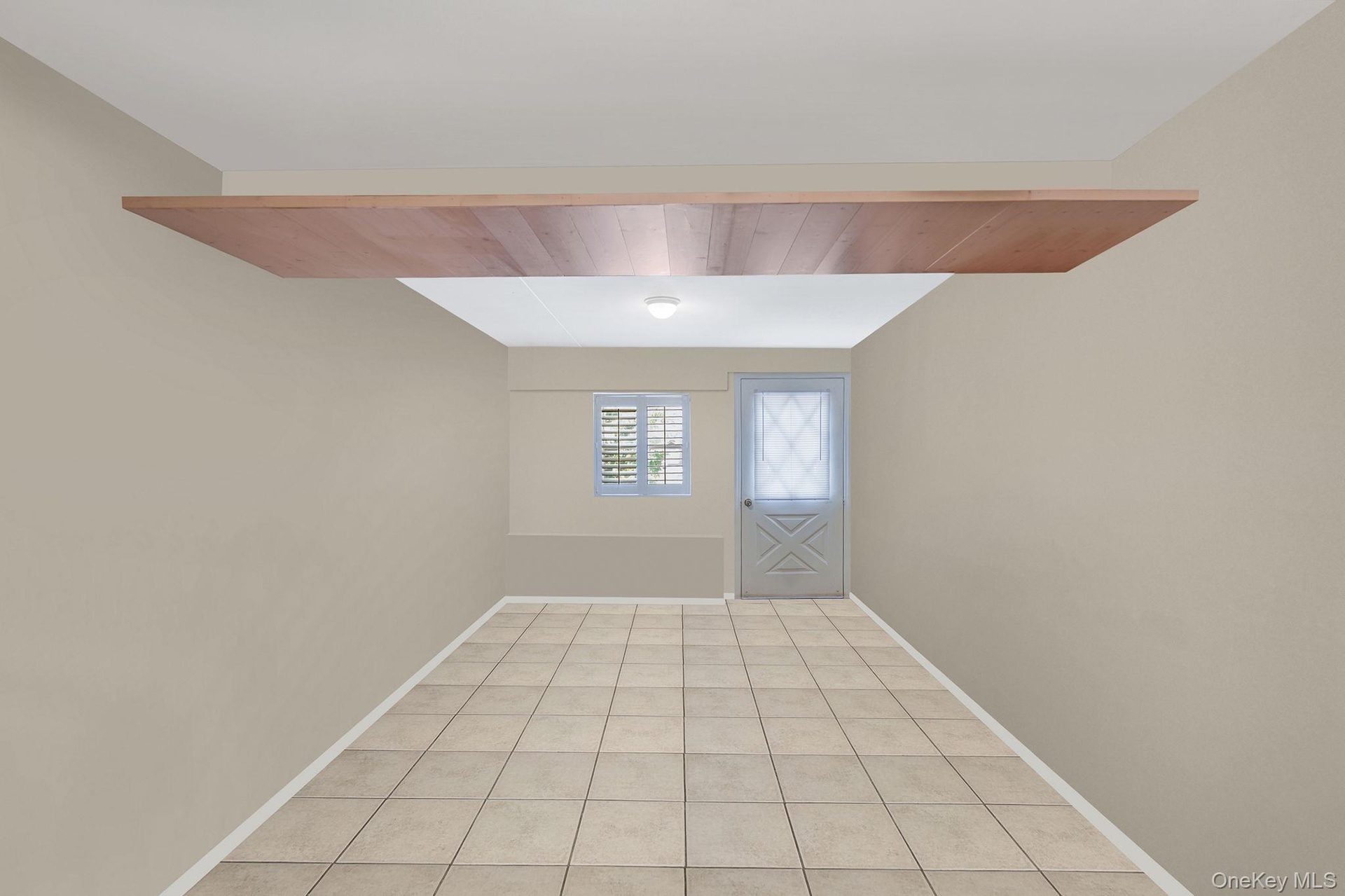 - Unfurnished room featuring wood ceiling and light tile patterned floors