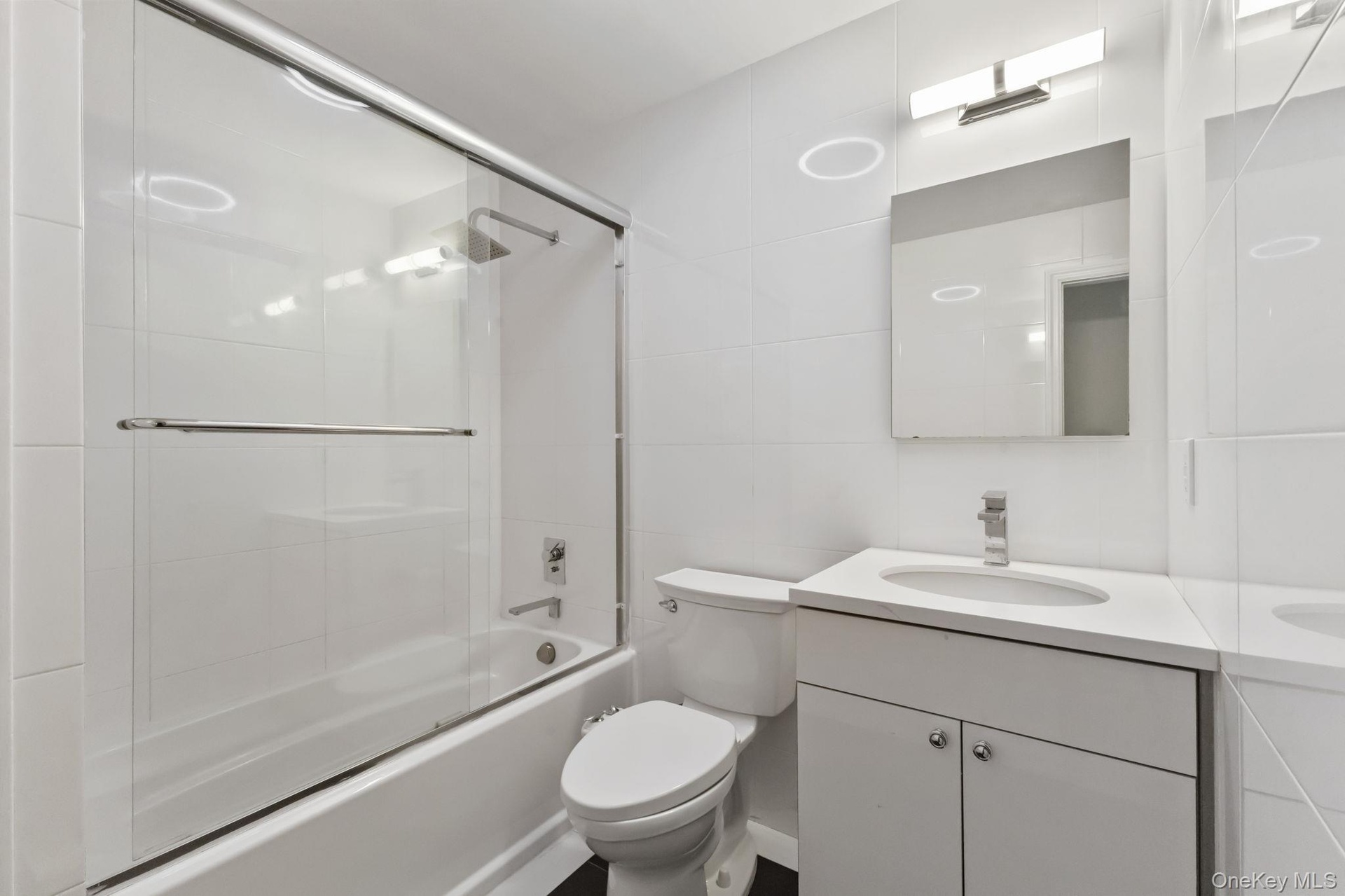 - Full bathroom featuring combined bath / shower with glass door, vanity, and tile walls