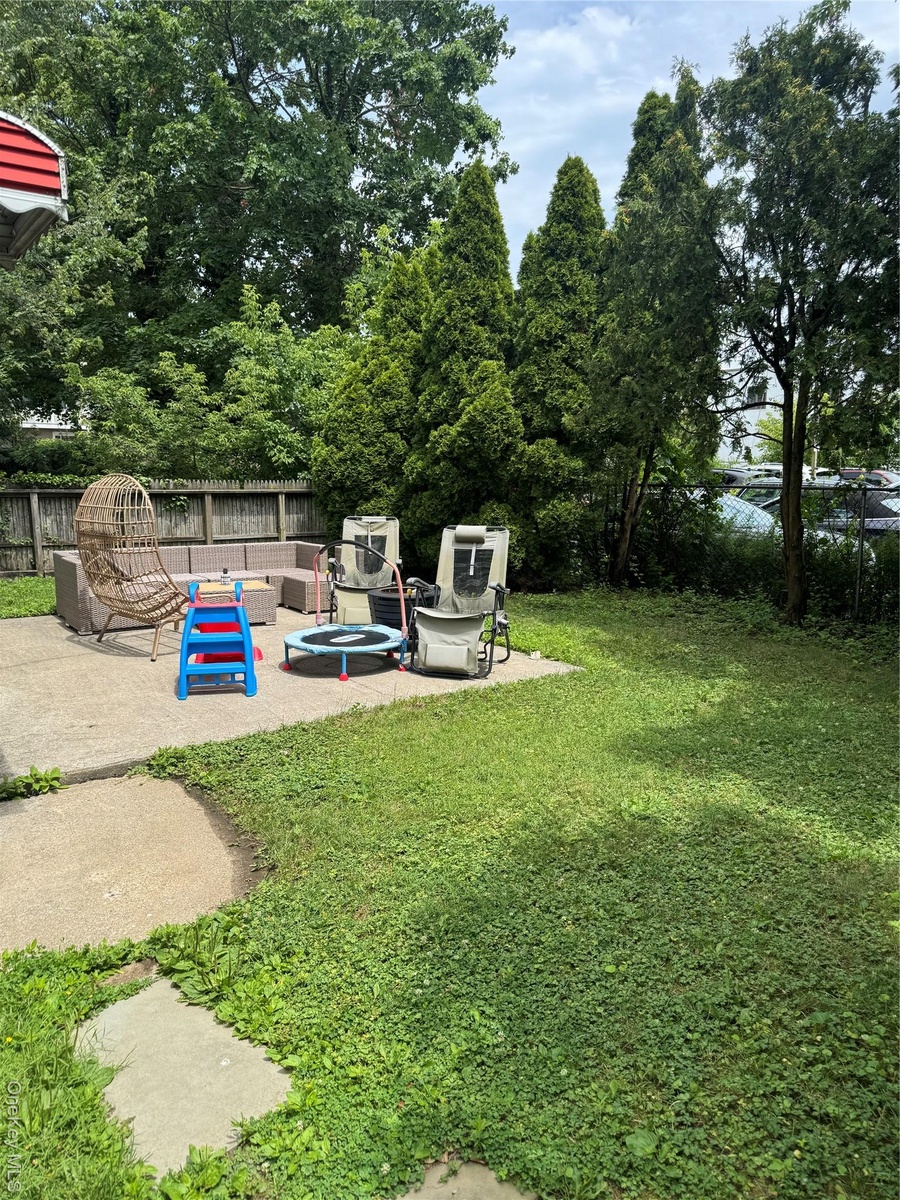 - View of yard featuring a patio and an outdoor living space with a fire pit