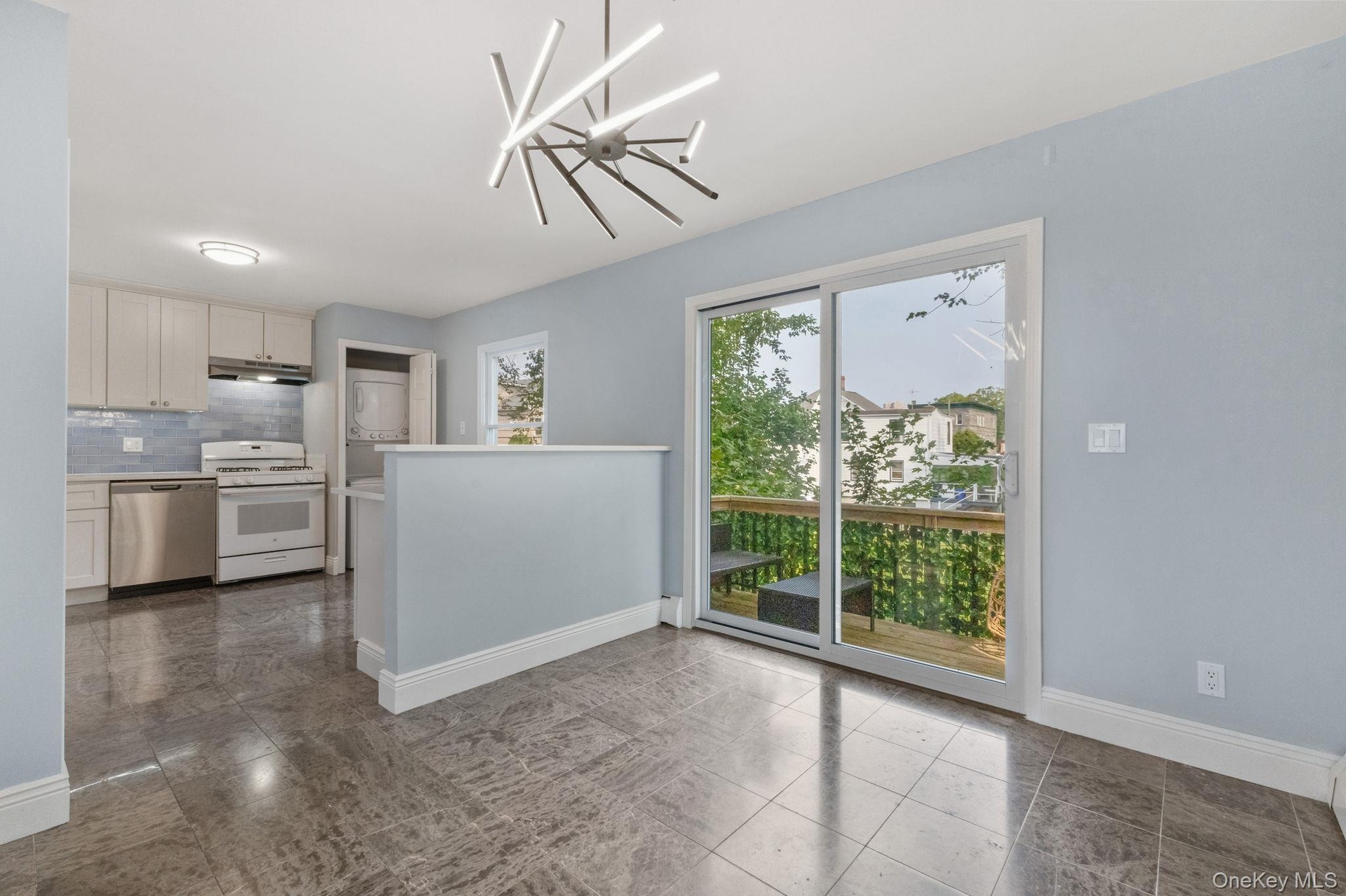 - Kitchen featuring a baseboard heating unit, appliances with stainless steel finishes, backsplash, white cabinets, and stacked washer and clothes dryer